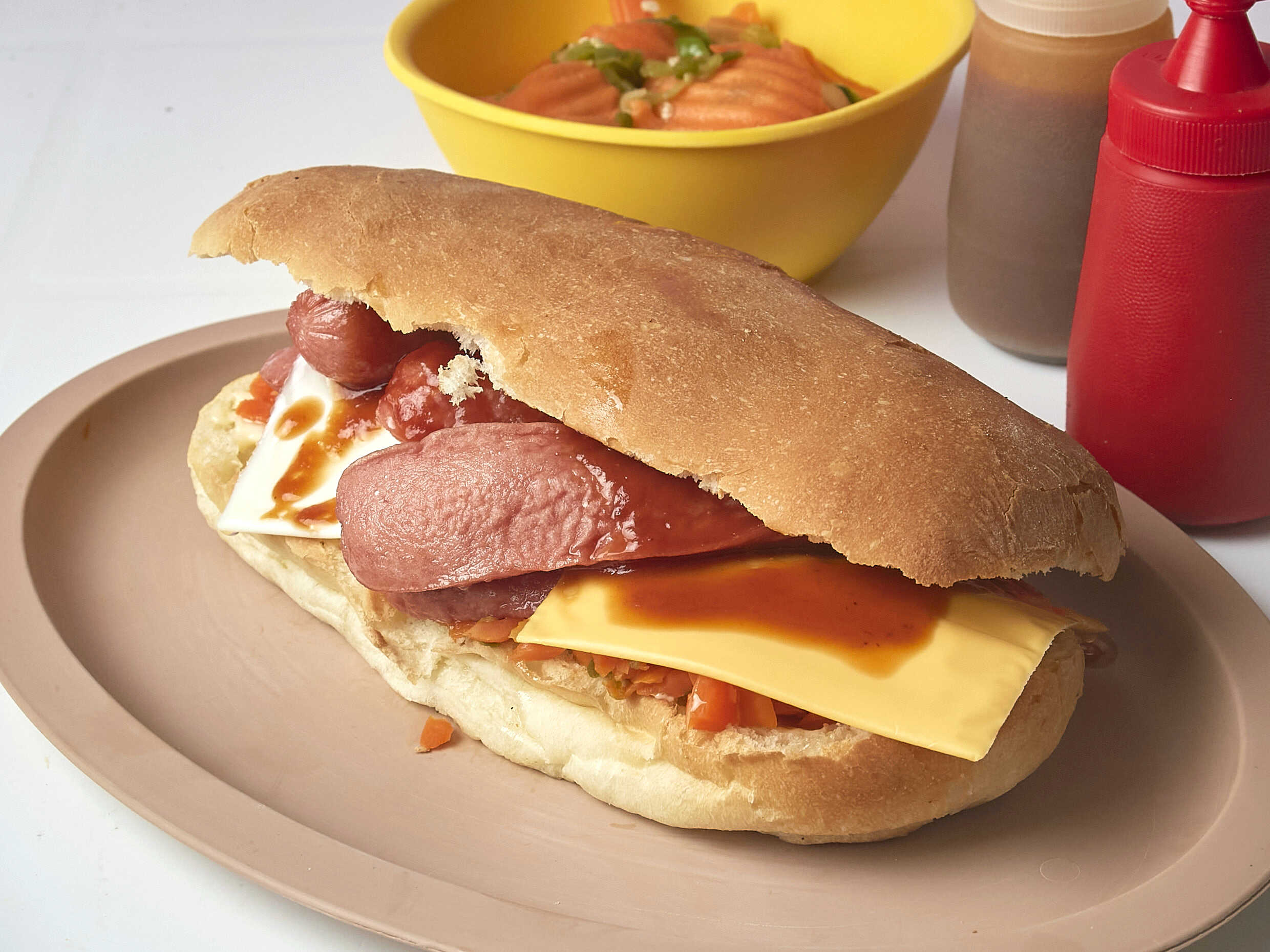 De 20 cm lleva mayonesa, mostaza, catsup, zanahoria con picante o sin picante, queso manchego y amarillo y 3 salchichas