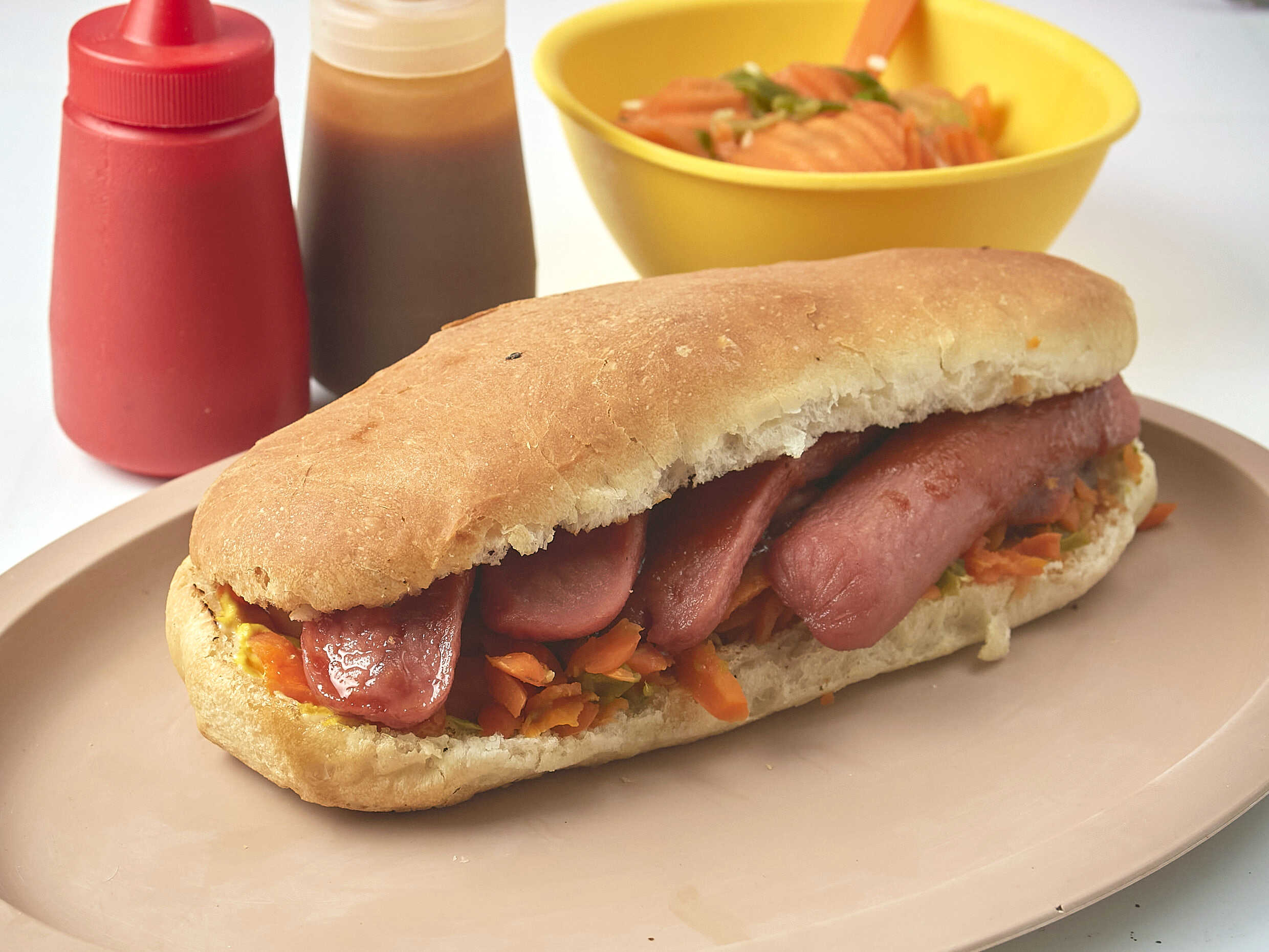 Hot diga de 20 cm, lleva mayonesa, mostaza, catsup, zanahoria con o sin picante y 2 salchichas