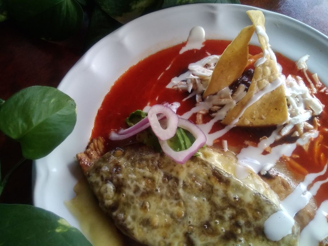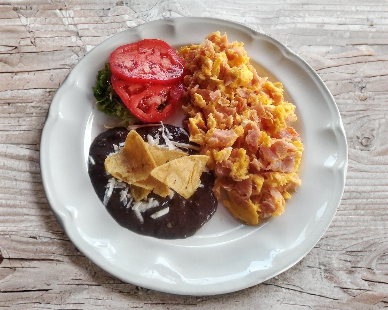 Tradicional receta (jitomate, cebolla y chile), acompañados de frijol y verduras.