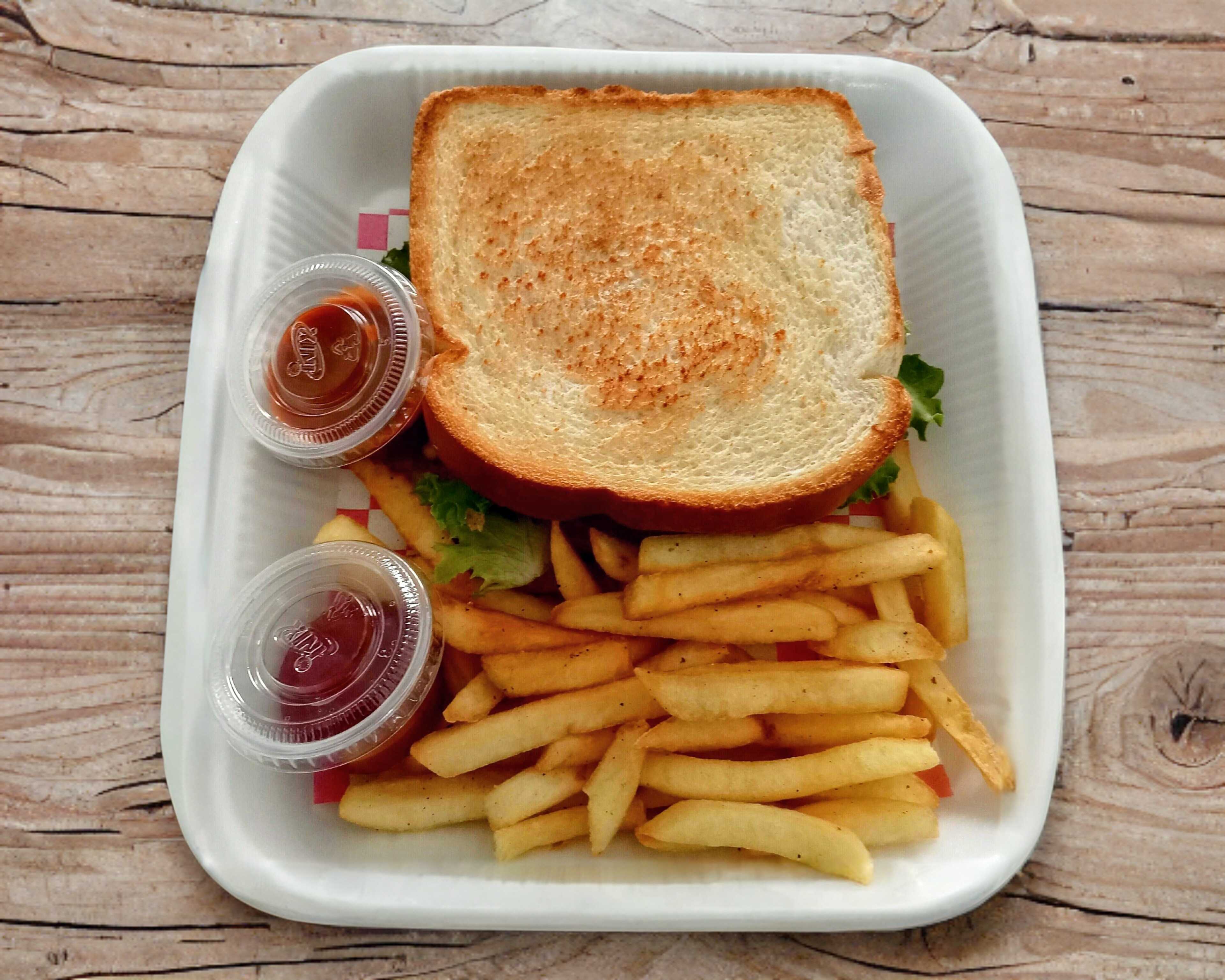 Un sándwich dé jamón con queso,verduras mayonesa y papas a la francesa