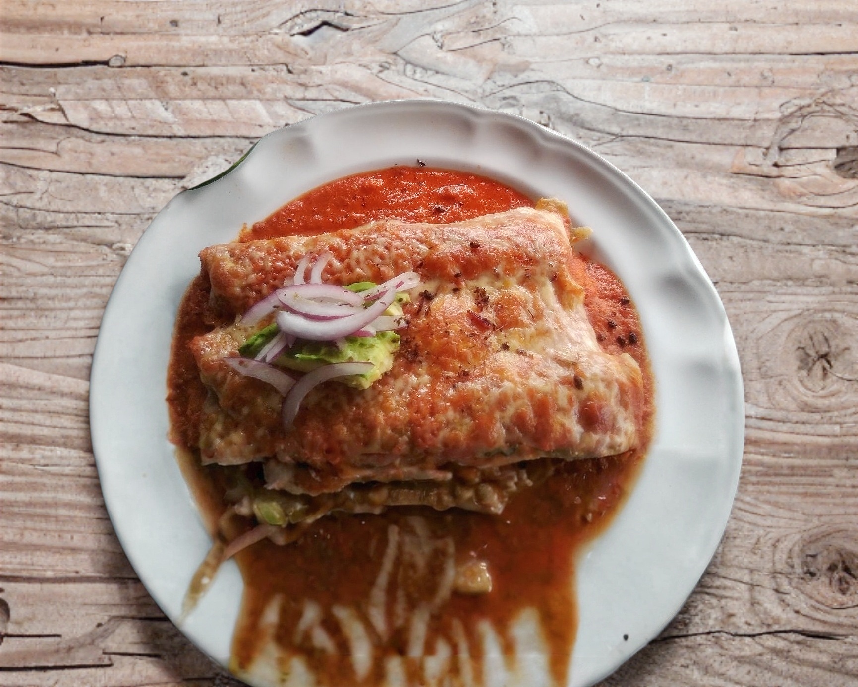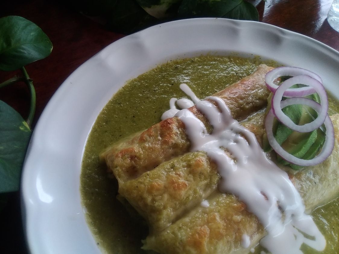 3 Piezas en salsa verde con poblano y queso gratinado con mozzarella.