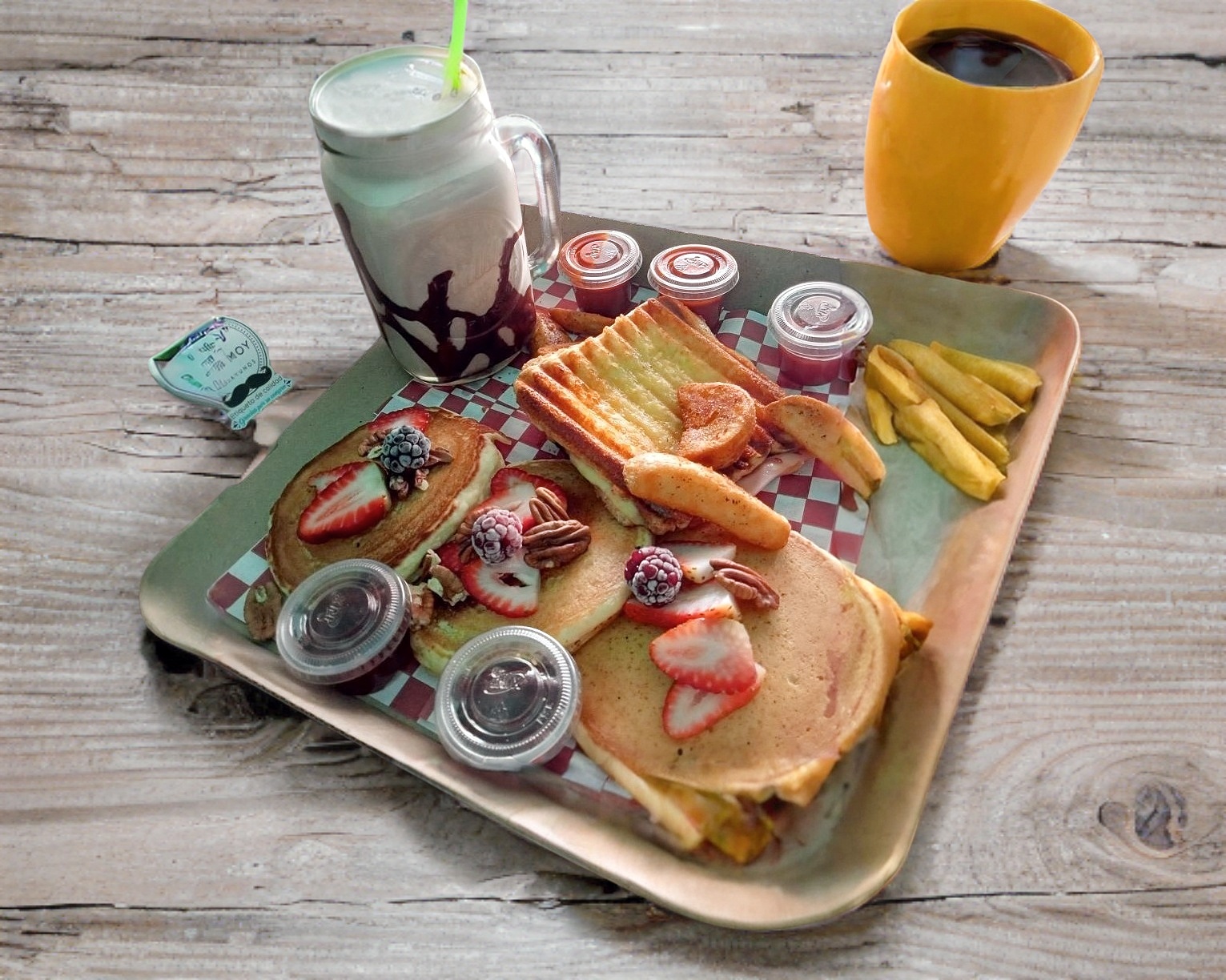 Deliciosa combinación de 3 hot cakes mini con topping, 1 rico sándwich de queso gratinado y doradito, papás gajo y 1 licuado de chocolate frío.