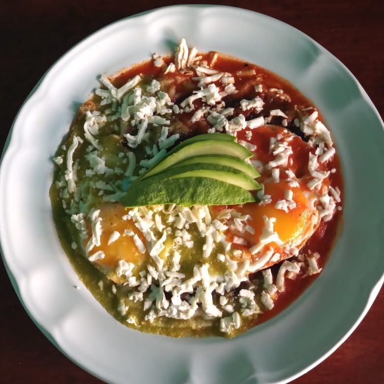 2 huevos estrellados con salsa roja y verde en una cama de tortilla y frijoles,queso panela crema y aguacate