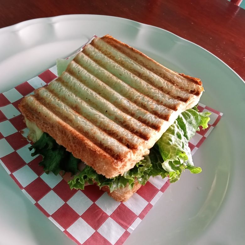 Pan blanco con queso manchego, verduras, jamón y lechuga.
