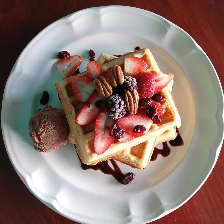 3 Piezas de waffles recién hechos con helado de chocolate, frutos del bosque y topping a elegir.