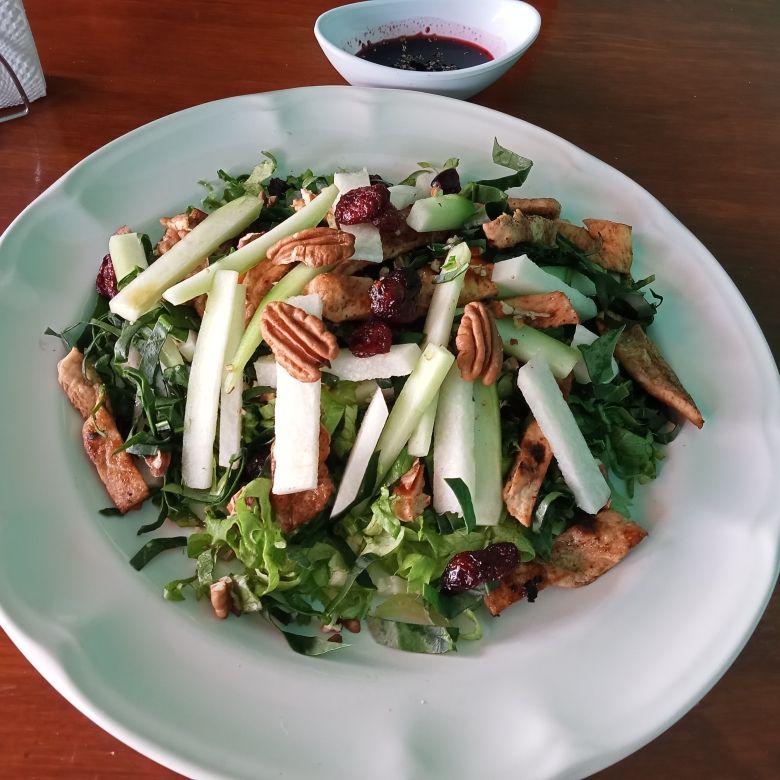 Jícama, pepino, pollo, arándano, nuez, queso y rico aderezo de naranja.