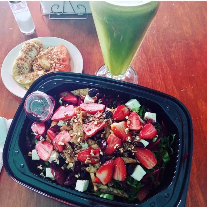 Fresa, arándano, pollo, nuez, queso panela, mix lechugas y delicioso aderezo de betabel.