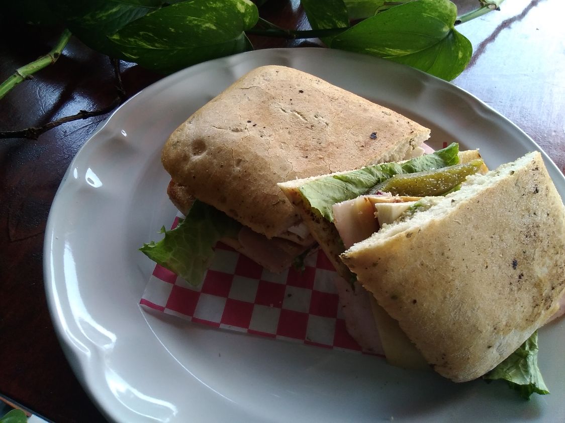 Rico pan de orégano, pollo, jamón, queso manchego y verduras.