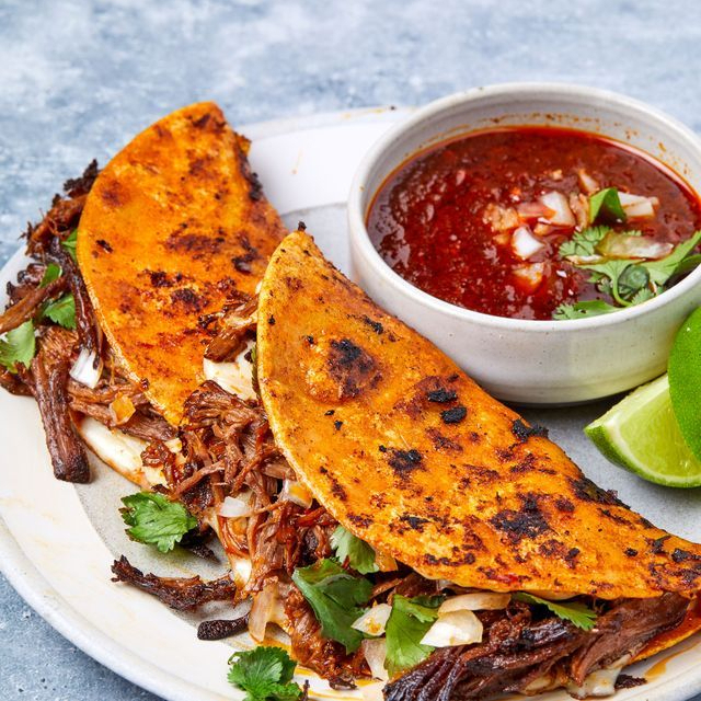 Tortilla de harina con nuestra deliciosa birria , queso gratinado , cebolla , cilantro, salsa , limones