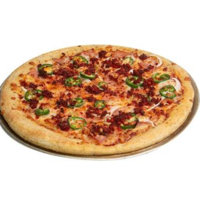 Pizza Grande con puré de tomate queso chorizo cebolla y chile jalapeño