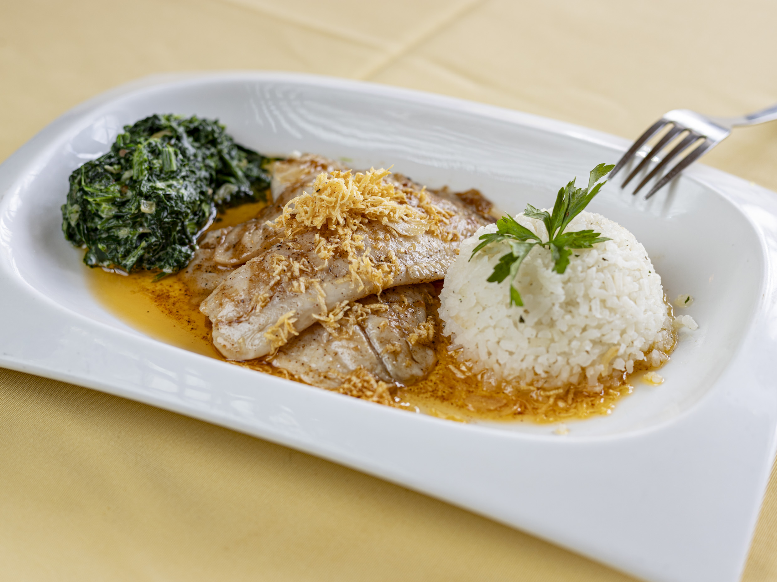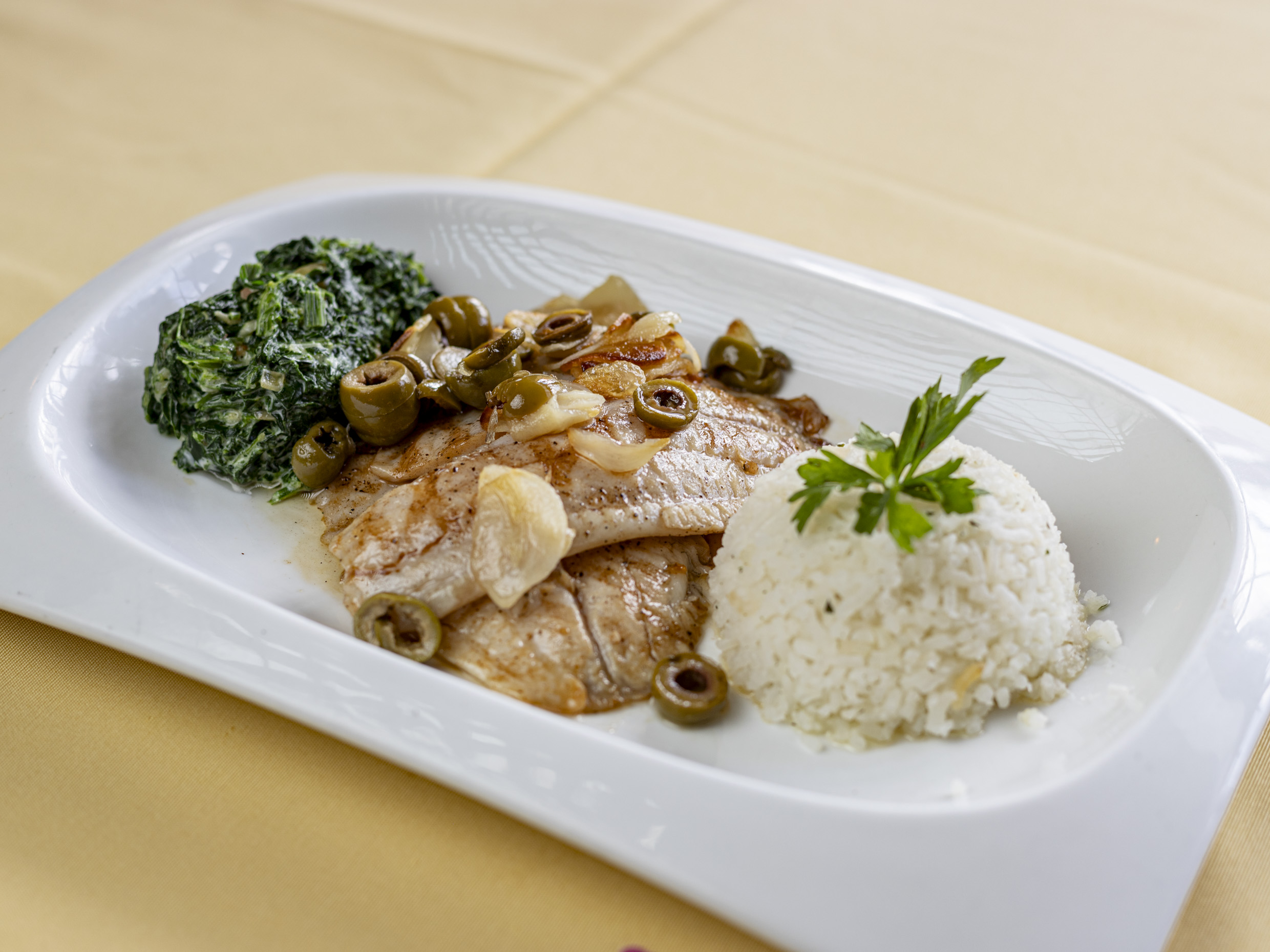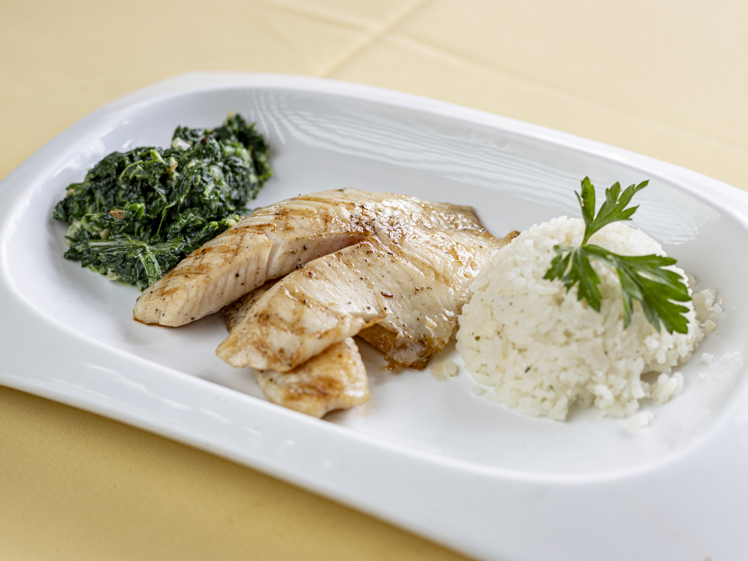 Filete de tilapia a la parrilla con aceite de olivo italiano, acompañada con arroz y espinaca.200g