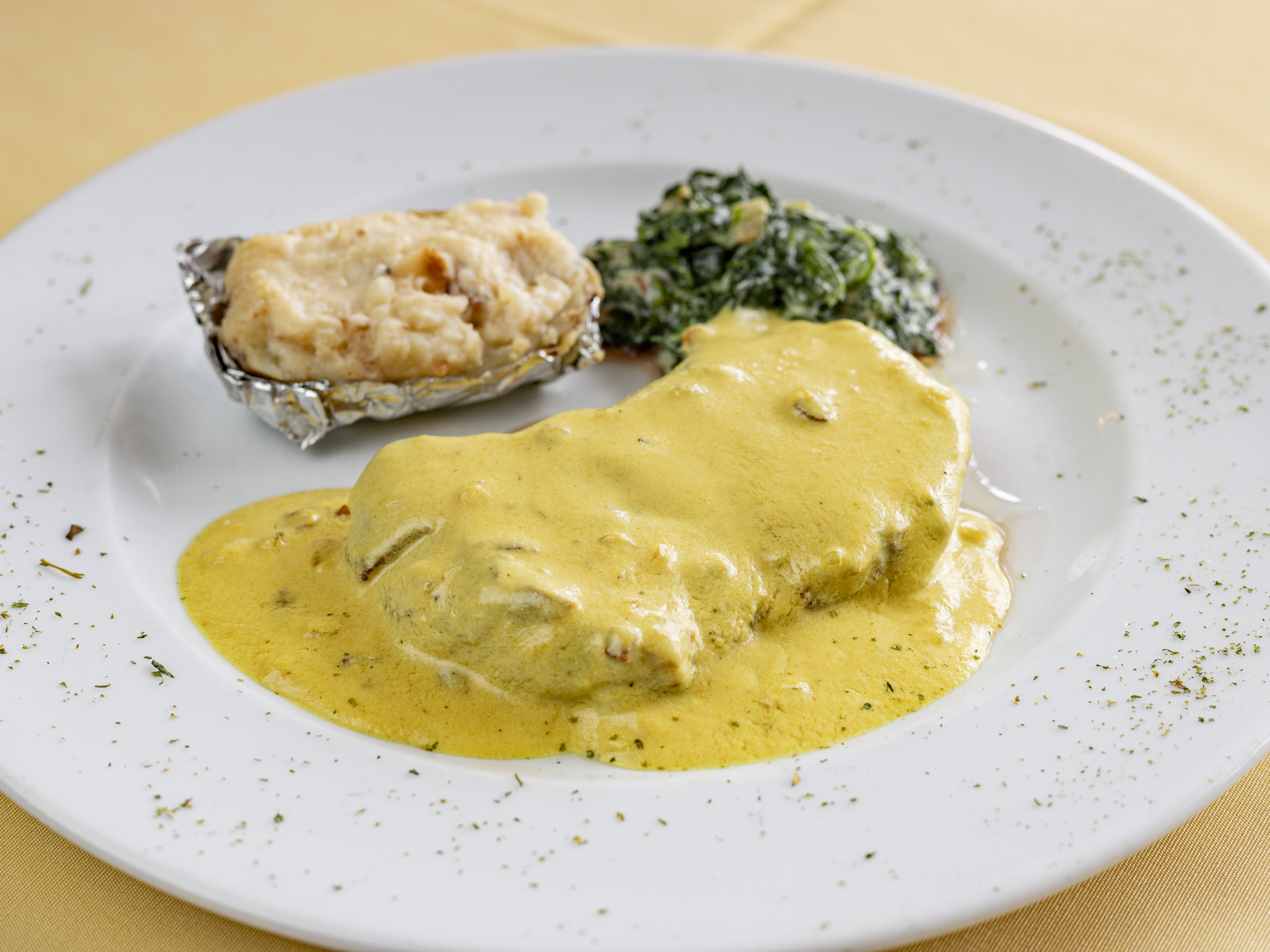 Filete de res con salsa de mostaza, papas y espinacas.