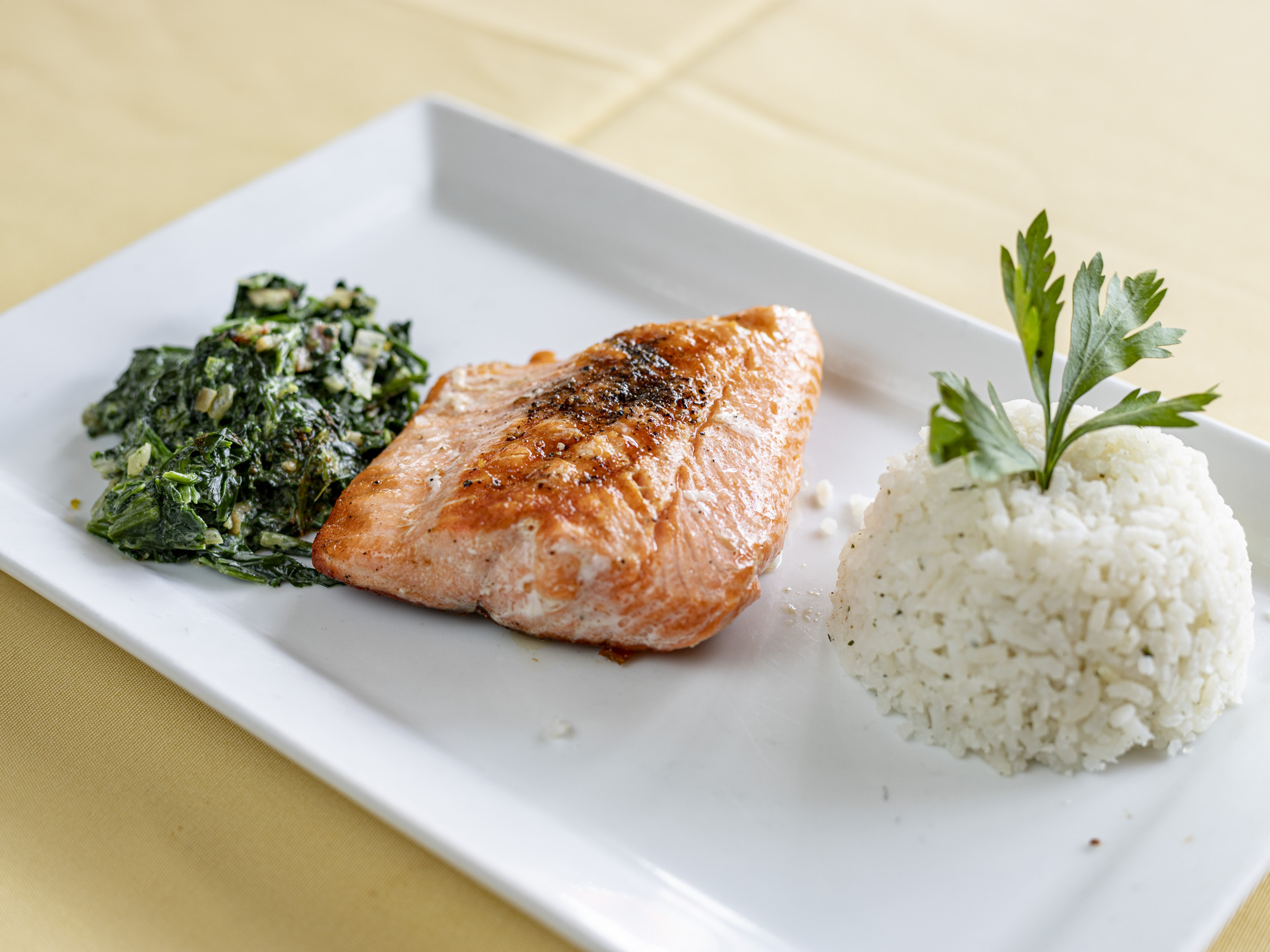 Salmón a la parrilla con aceite de olivo italiano, alcaparras, aceituna negra acompañada de arroz y espinaca.200g