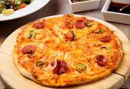 Salsa de tomate natural, queso gouda, chorizo, chile jalapeño y cebolla. Elige el tamaño Chica (24cm y 220g) o Grande (30cm y 260g)
