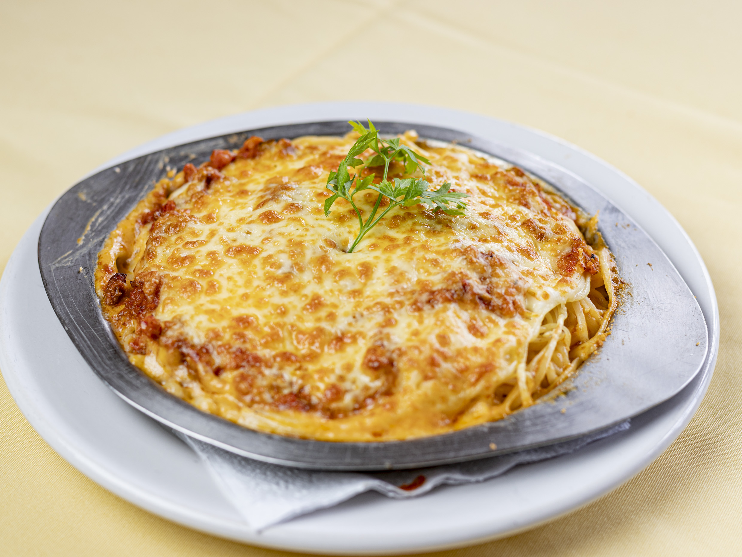 Pasta con tomate natural, pelati, carne molia de res, cebolla, apio, zanahoria, huevo, crema y queso mozzarella gratinado al horno.200g