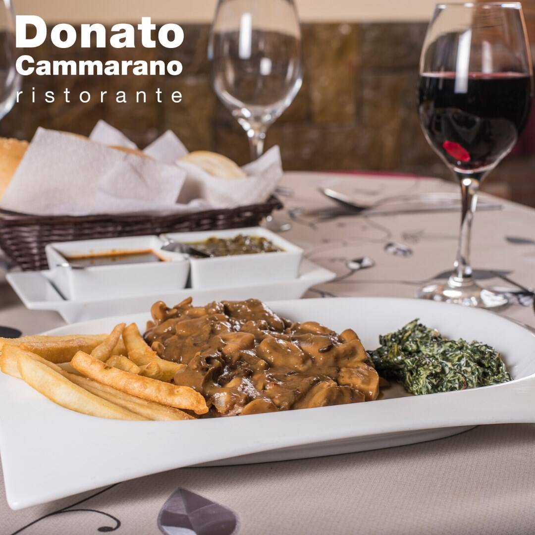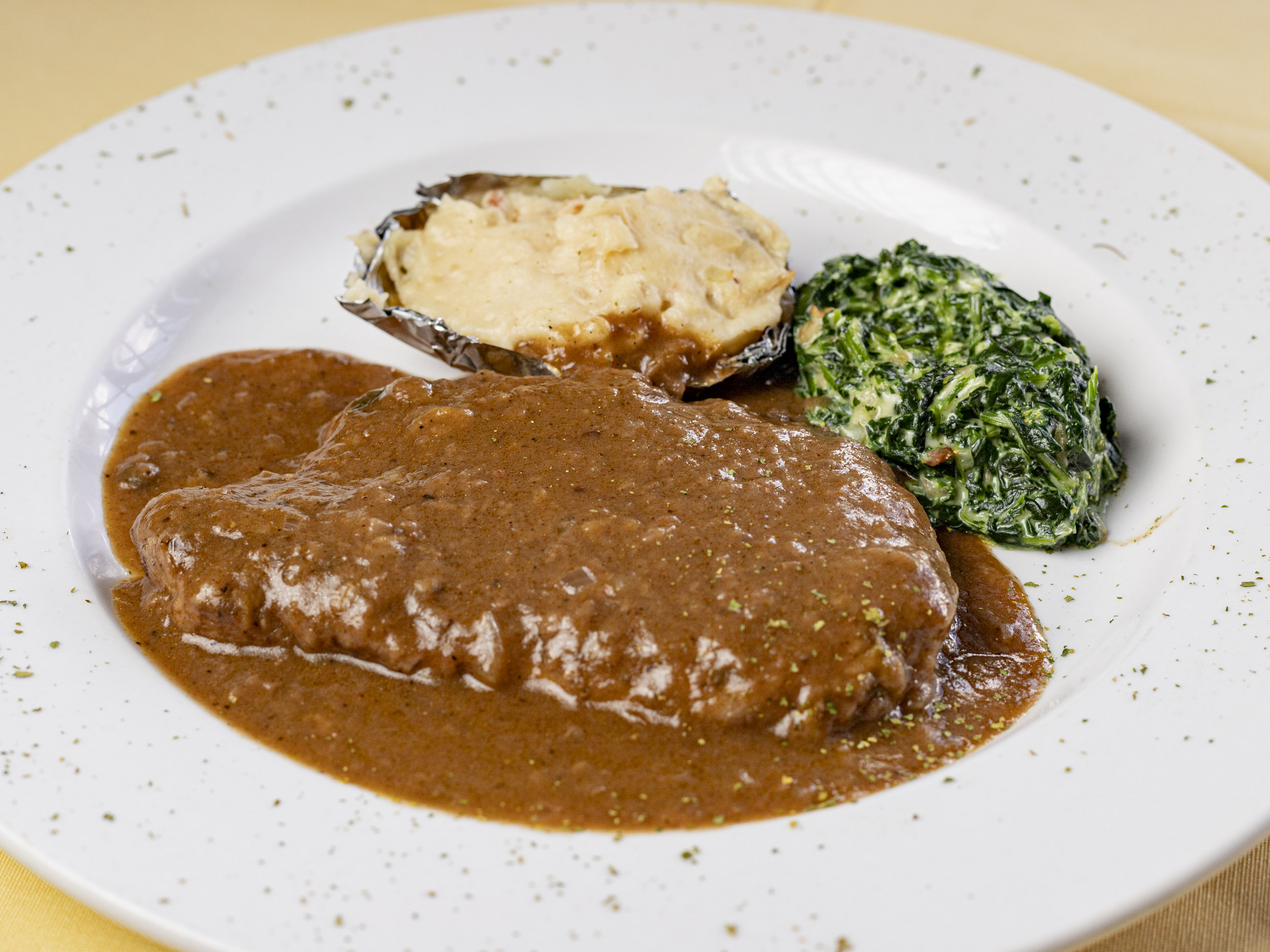 Filete de res, con champiñones, tocino, salsa gravy, papas y espinacas.