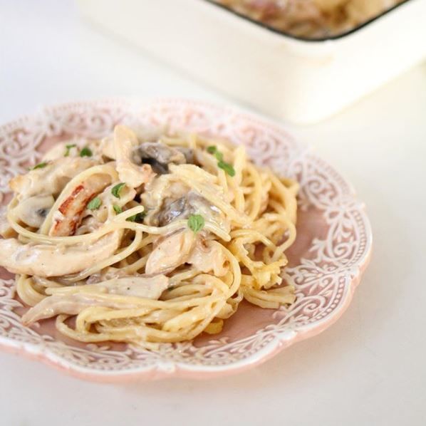 Pasta con crema, jamón, pimiento, champiñón y pollo. 200g
