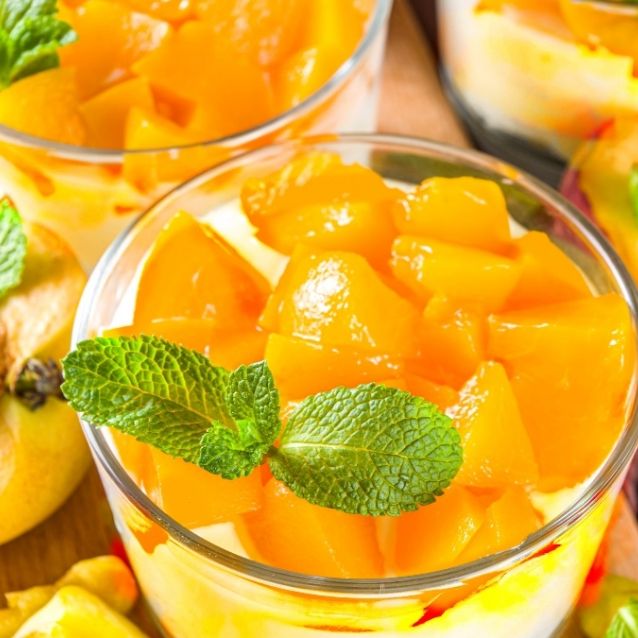 Duraznos en almibar con licor de rompope.
