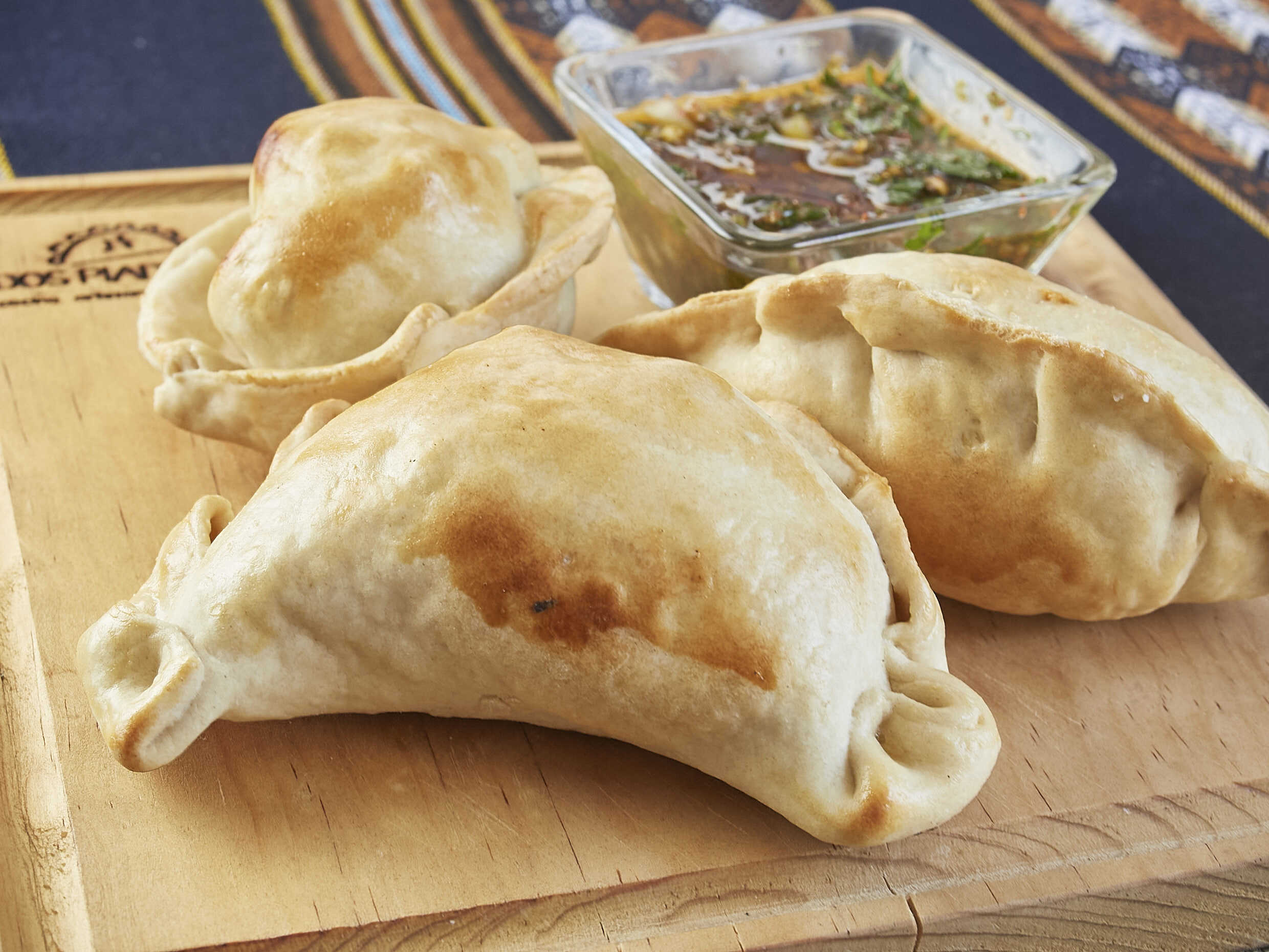 3 Empanadas argentinas con chimichurri + 3 alfajores tradicionales + 1 choripan artesanal con chimichurri.