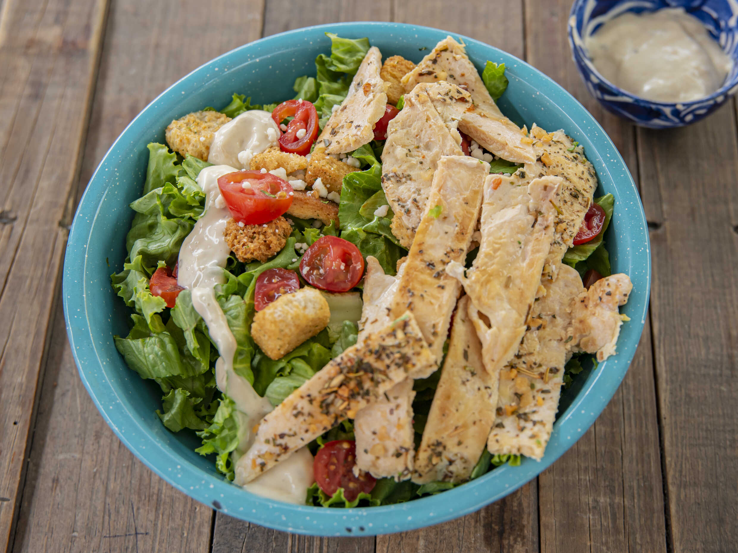 Lechuga, tomate Cherry, parmesano, crotones y pechuga asada (aderezo cesar)