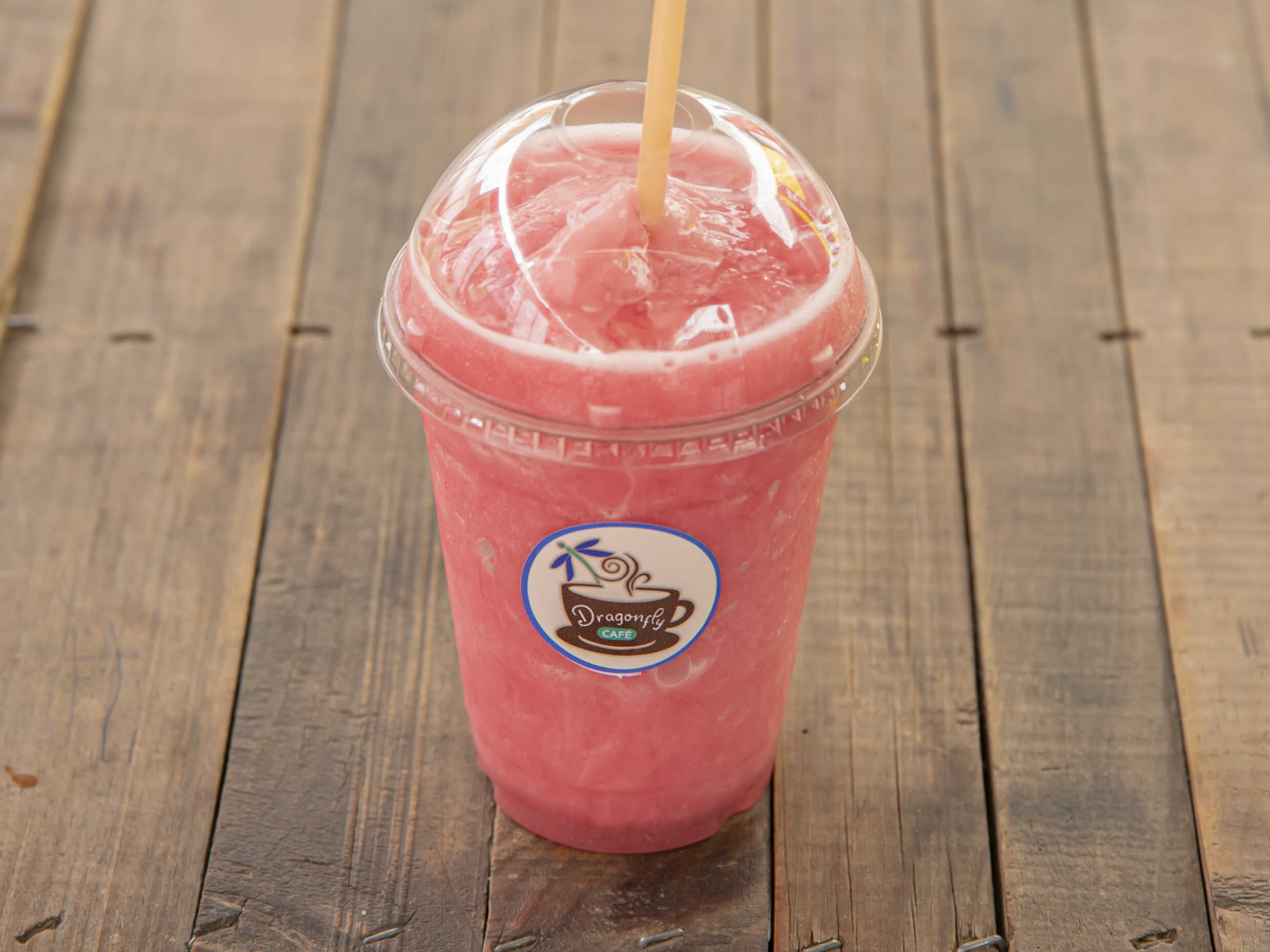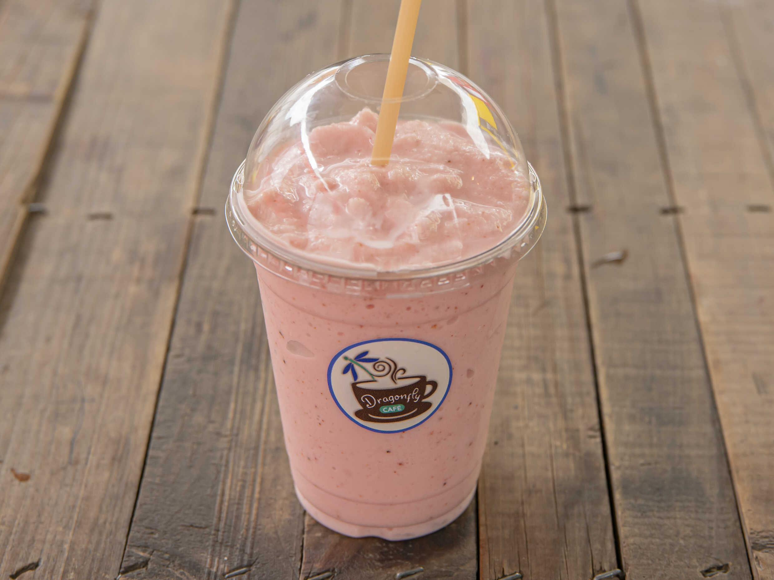 bebida realizada con leche deslactosada, fresa y hielo molido