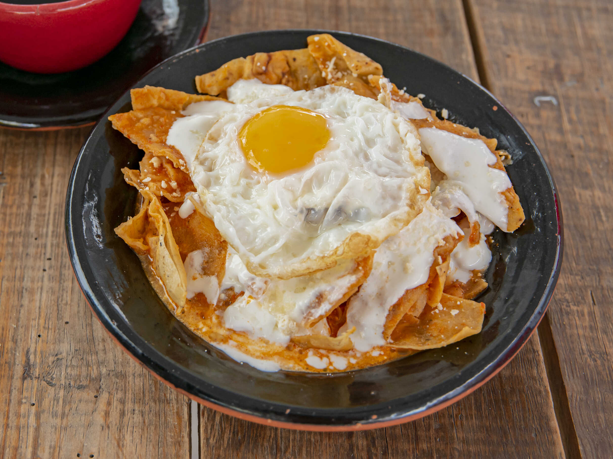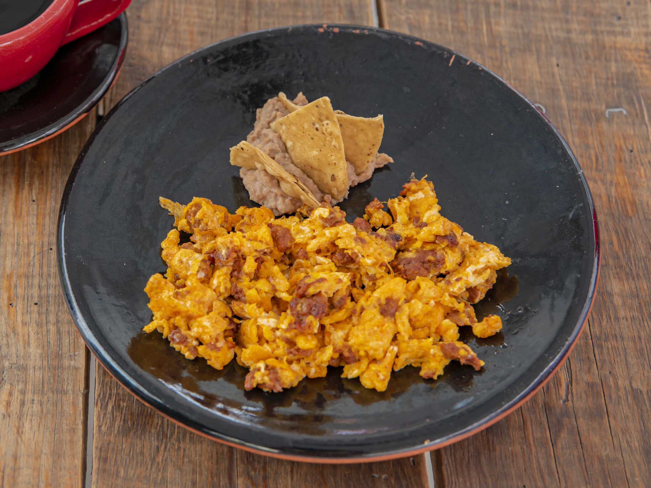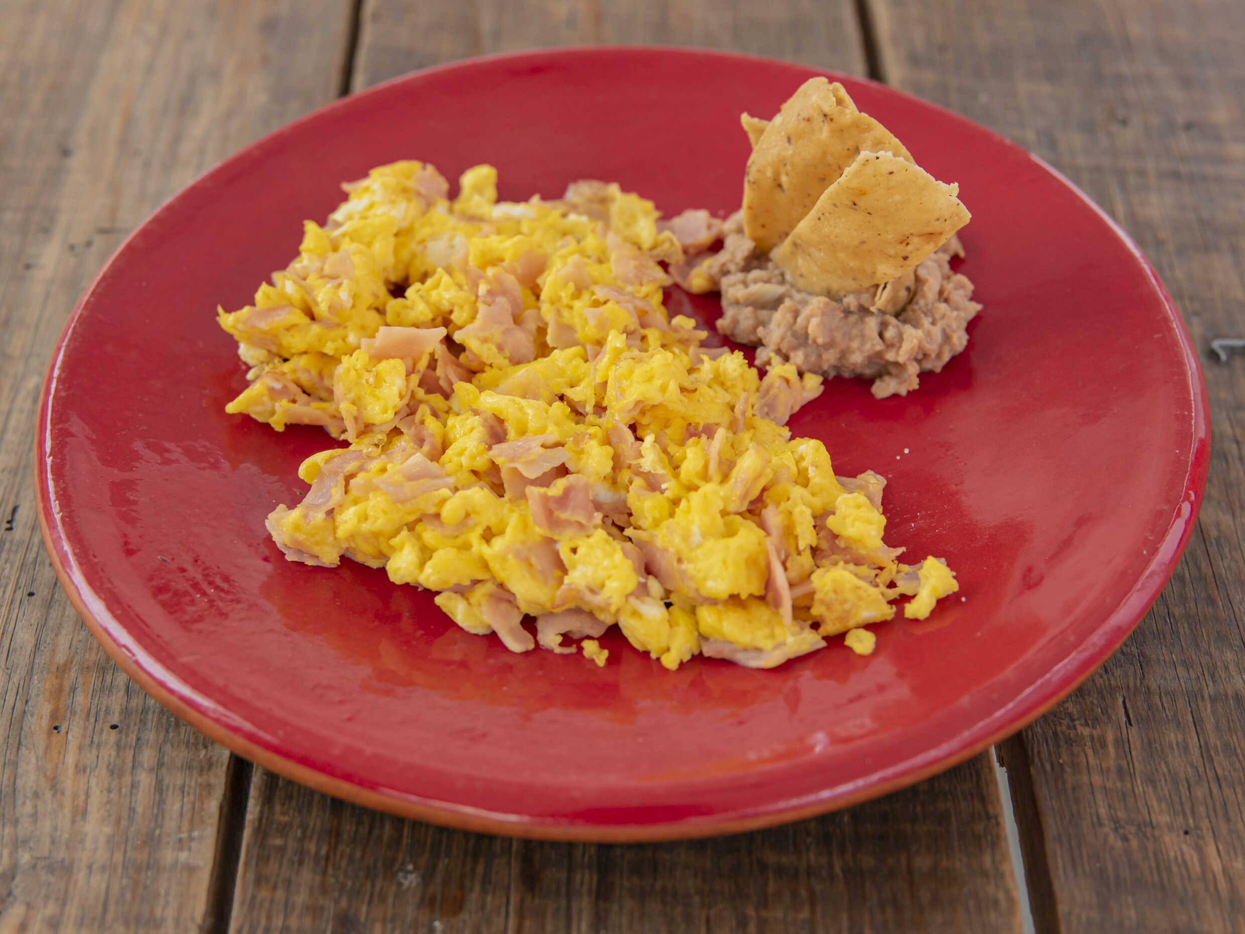 3 piezas de huevo revueltos con jitomate, cebolla y chile finamente picado.