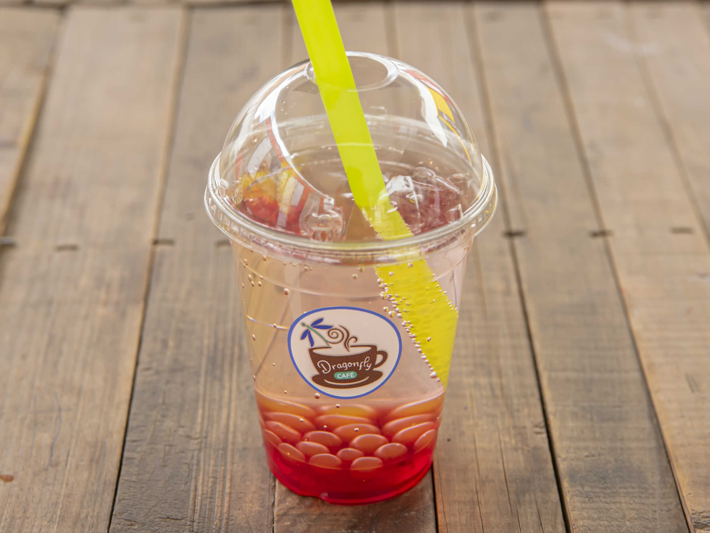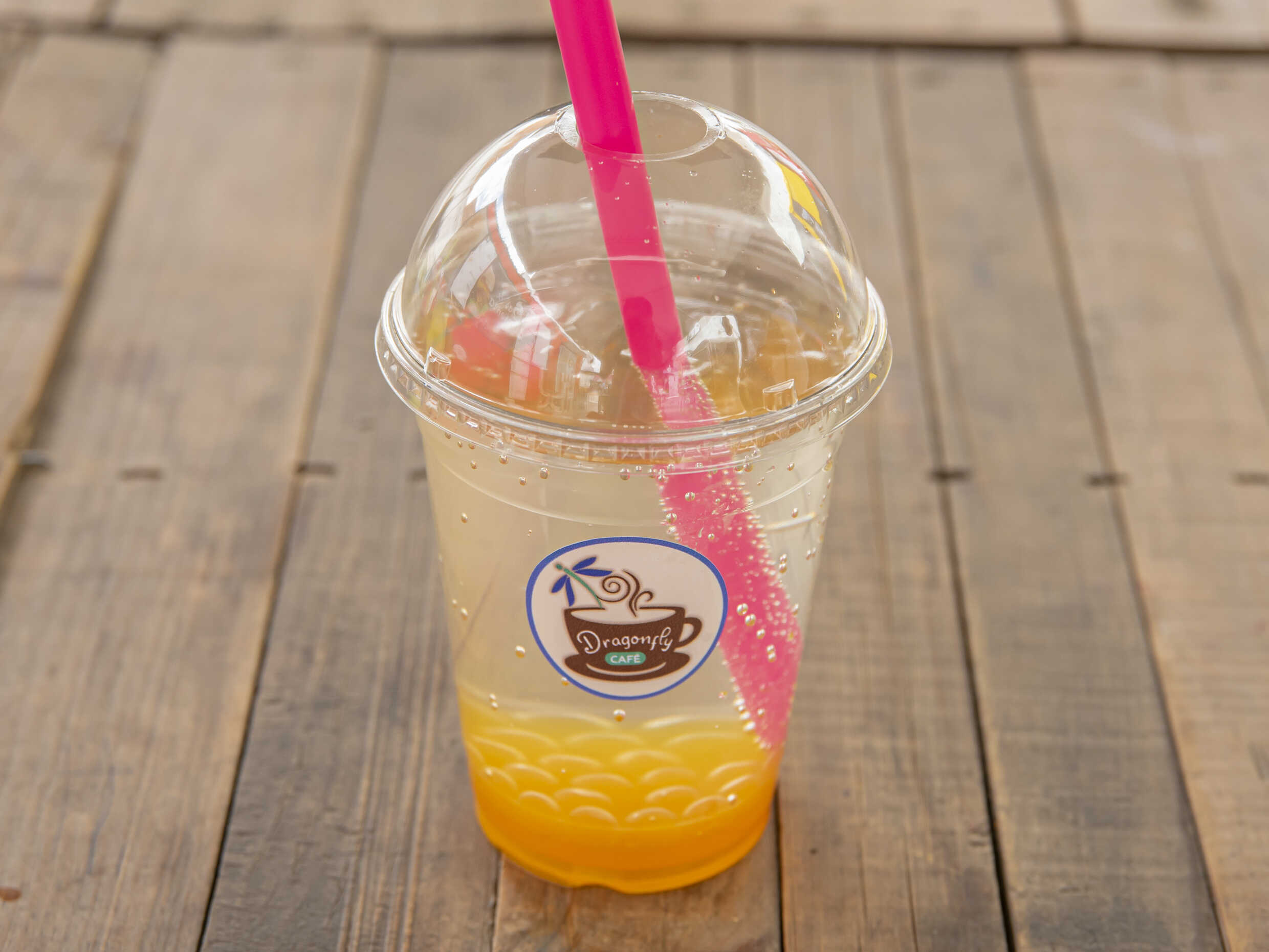 bebida refrescante y burbujeante que se prepara con agua carbonatada, jarabe aromatizado y hielo. Acompañado con perlas explosivas de sabor