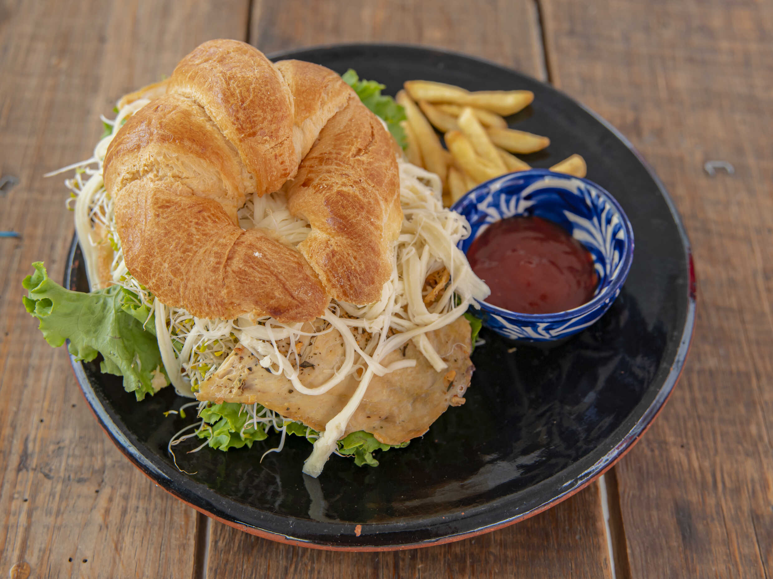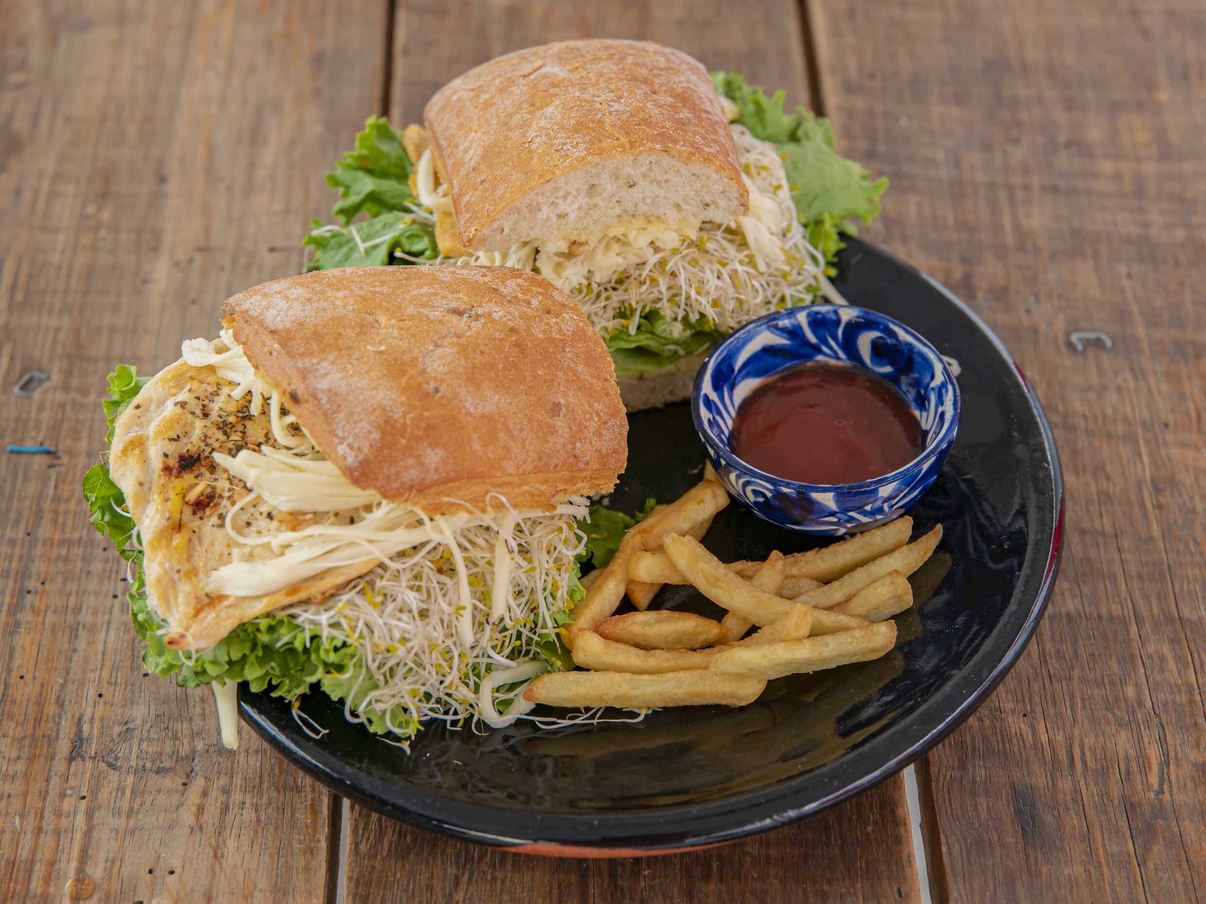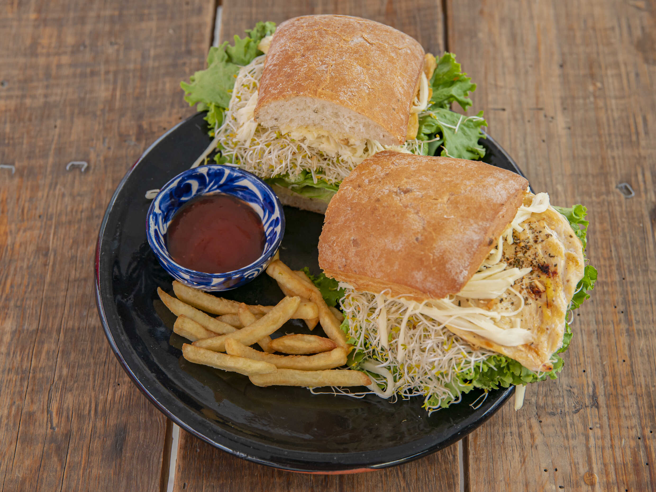 Mayonesa, lechuga, germen de alfalfa, pechuga asada y quesillo. Acompañadas con papas a la francesa