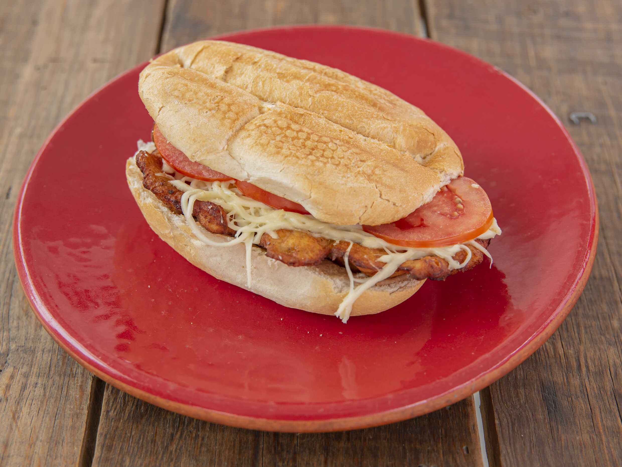 Torta de agua, quesillo, mayonesa, frijoles, jitomate, milanesa de pollo empanizada. A la plancha