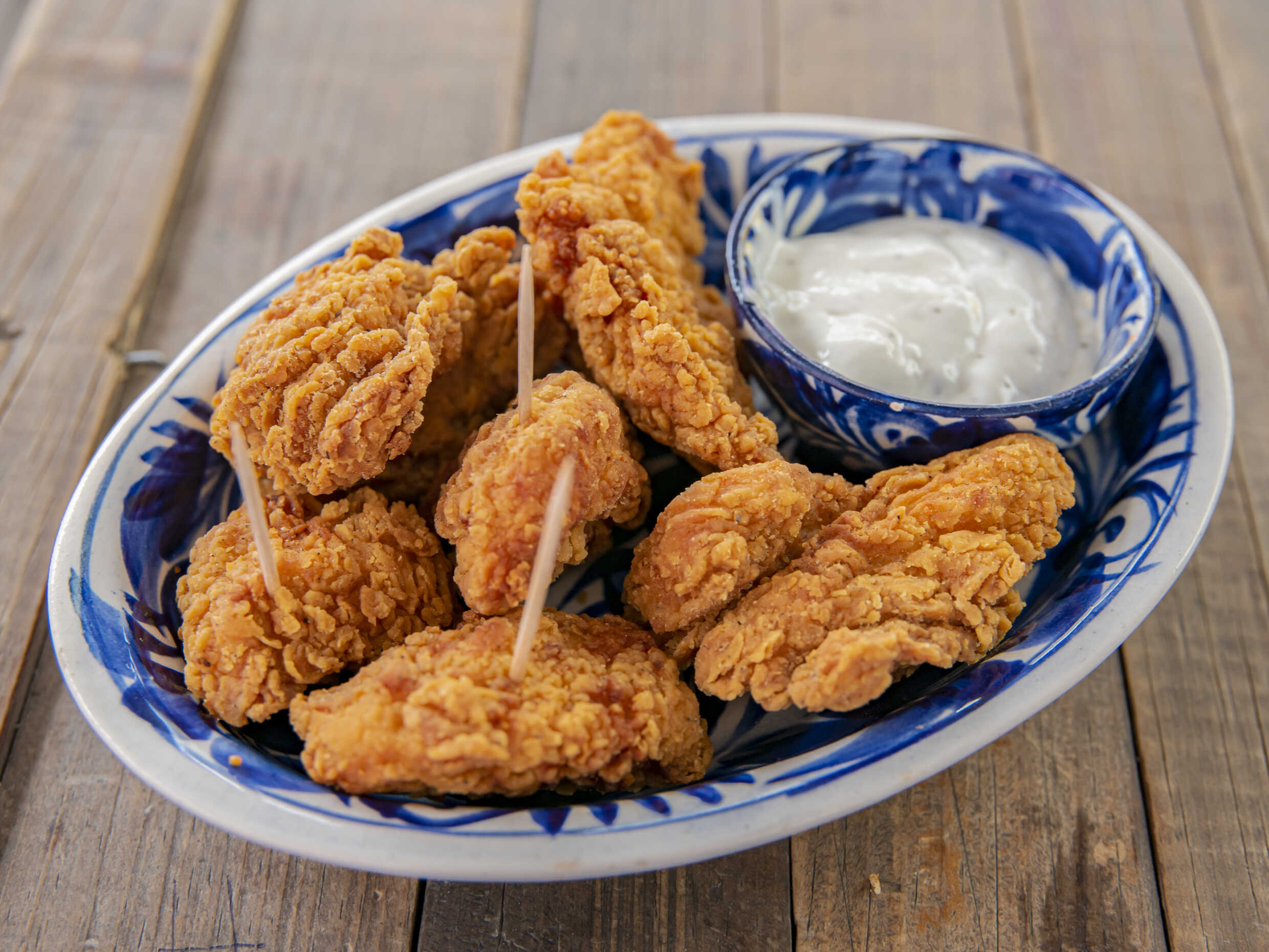 Lechuga, pico de gallo, totopos, pechuga empanizada (aderezo ranch)
