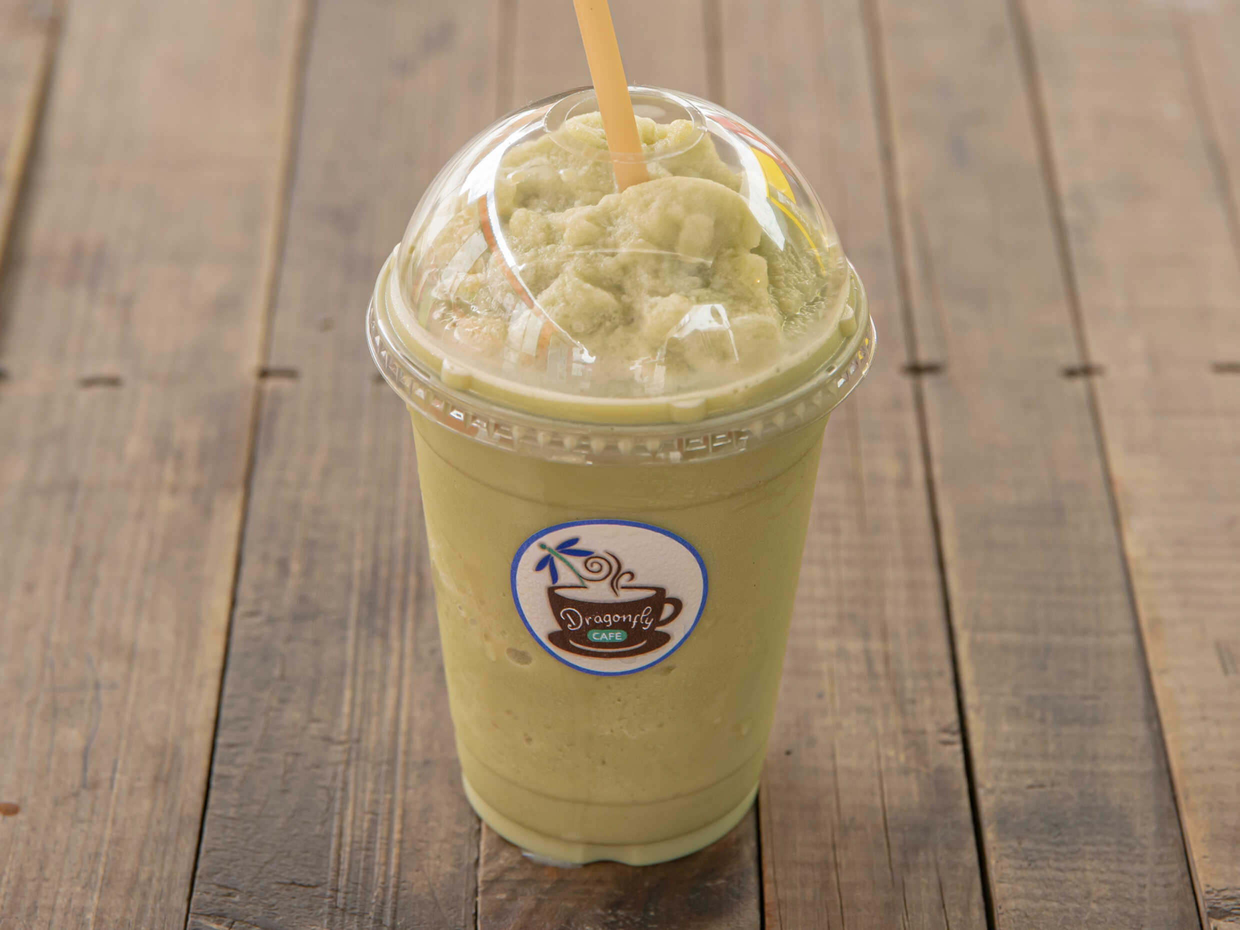 bebida realizada con leche deslactosada, matcha y hielo molido