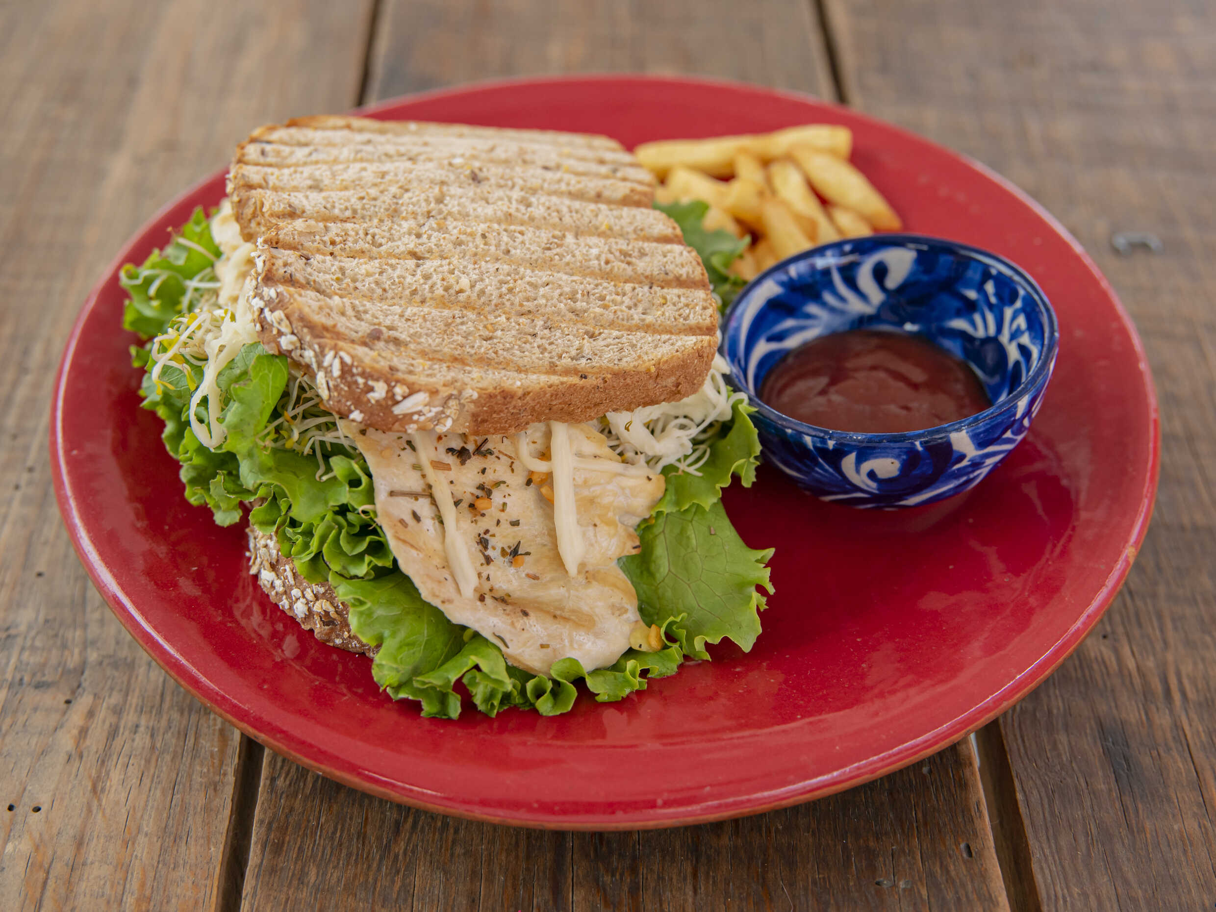 Mayonesa, lechuga, germen de alfalfa, pechuga asada y quesillo. Acompañado de papas a la francesa