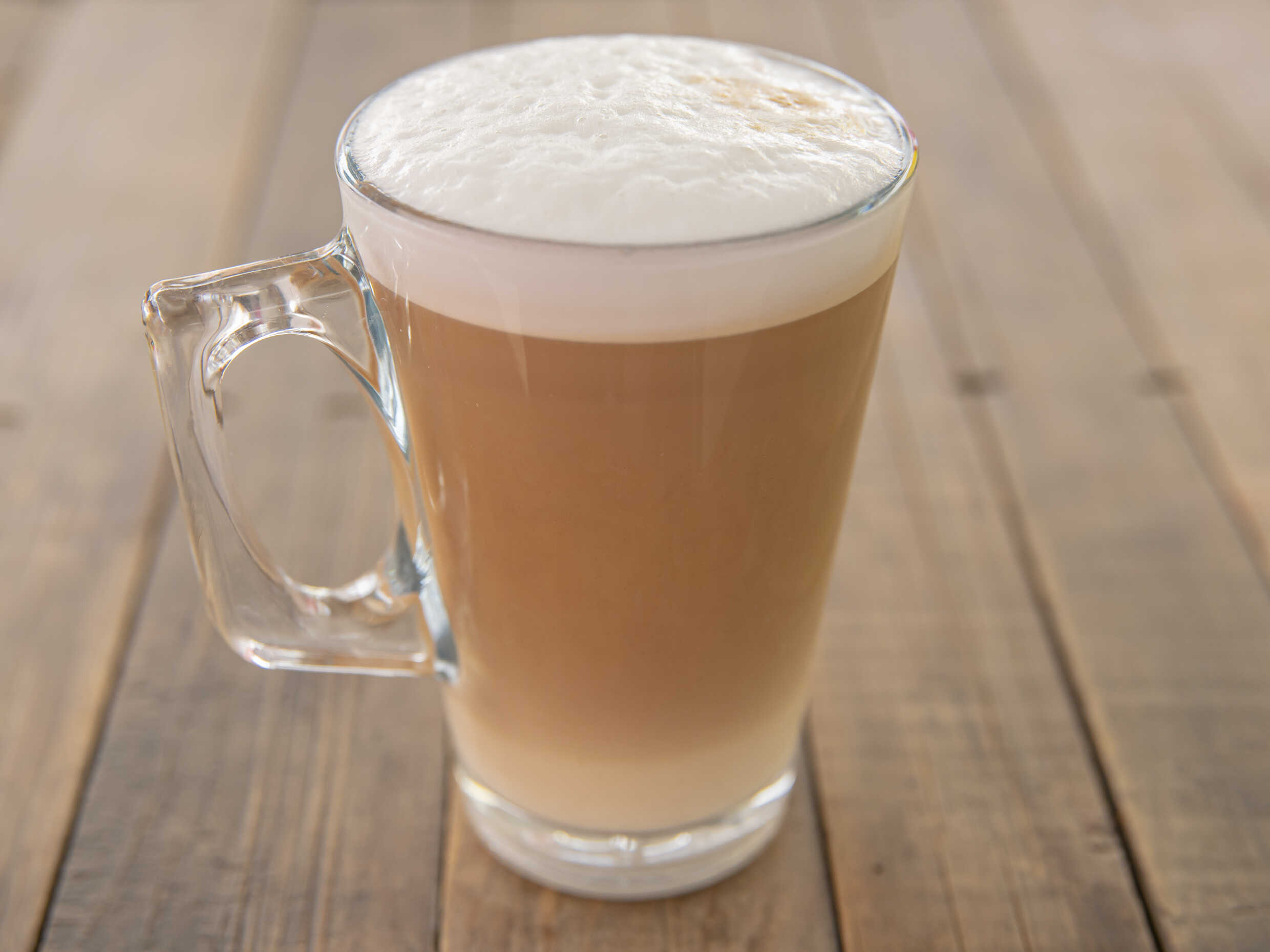 bebida de café con leche deslactosada, shot de espresso, leche al vapor sin espuma.