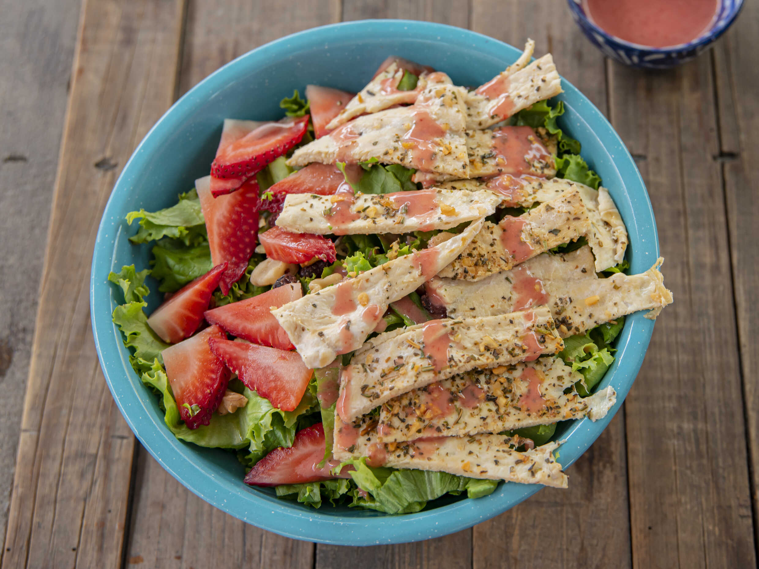 Lechuga, frutos deshidratados, fresa, pechuga asada (aderezo de fresa)