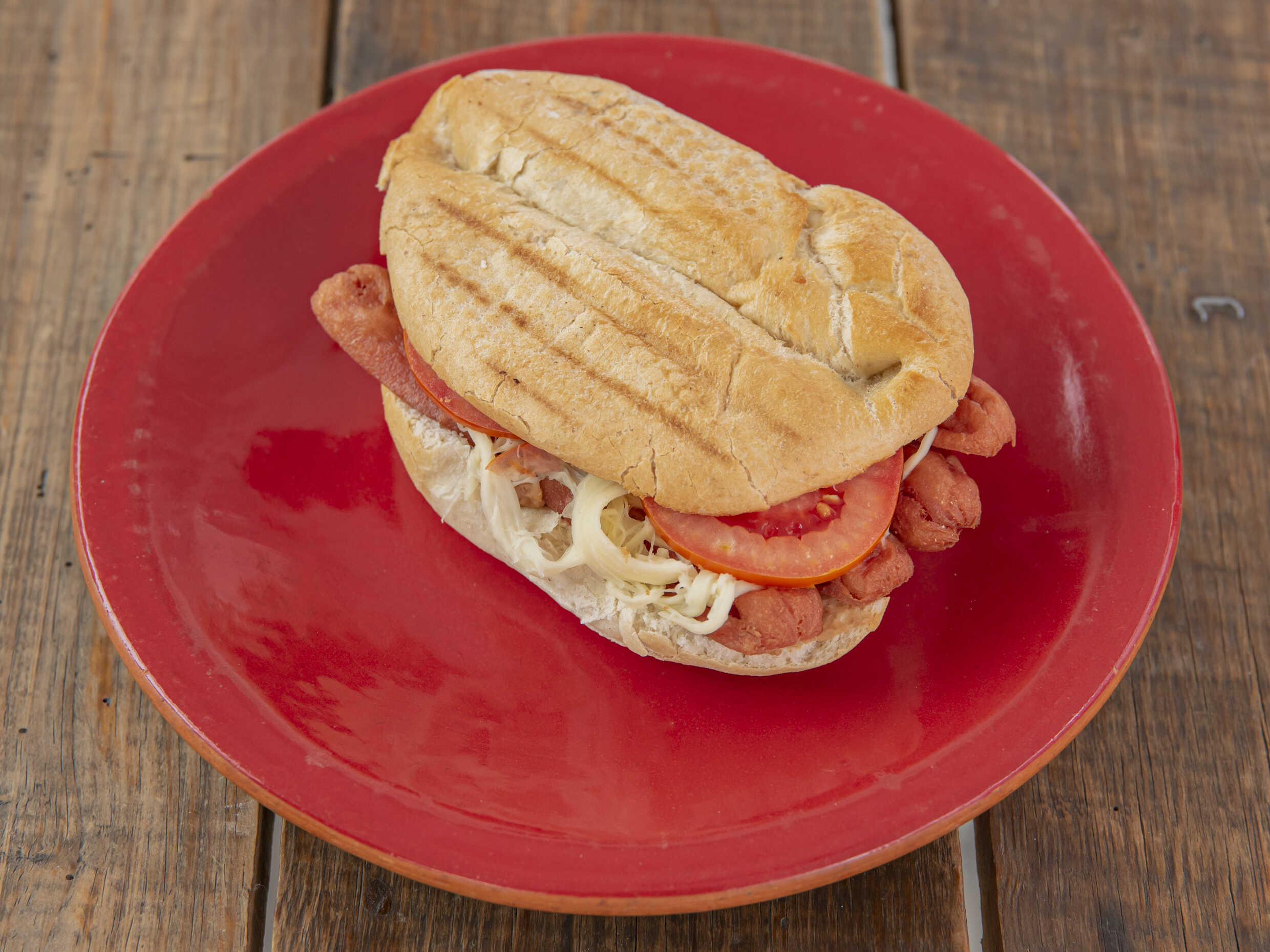 Torta de agua, quesillo, mayonesa, frijoles, jitomate, salchicha. A la plancha