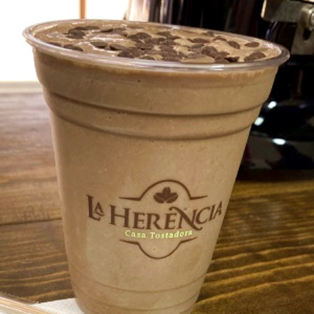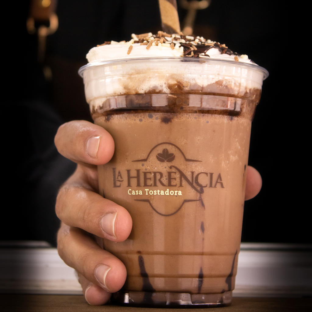 Bebida a base de hielo, leche, chocolate y espresso decorado con panna y galleta