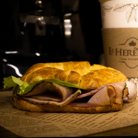 Cuernito, con aderezo de la casa, jamon y queso artesanal, lechuga y pimientos