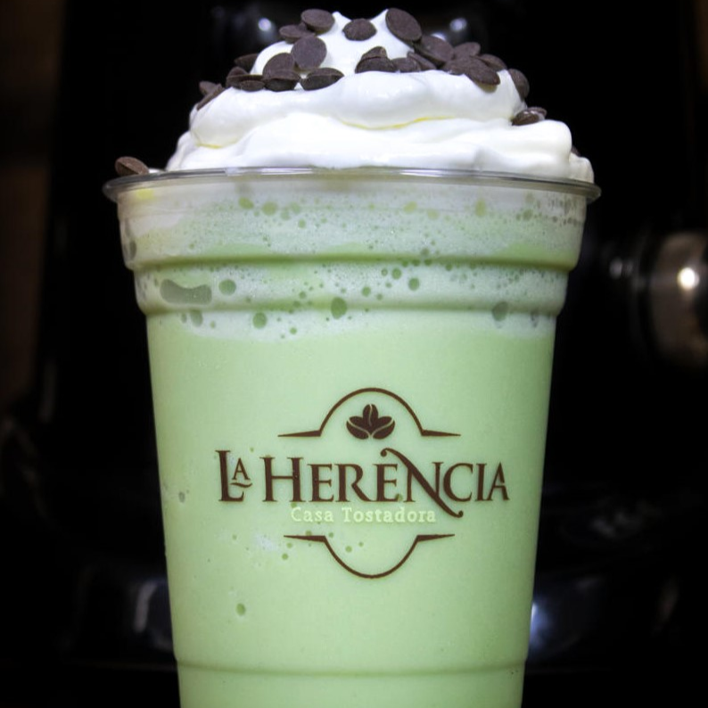 Bebida a base de hielo, leche y Té Matcha decorado con panna y chispas