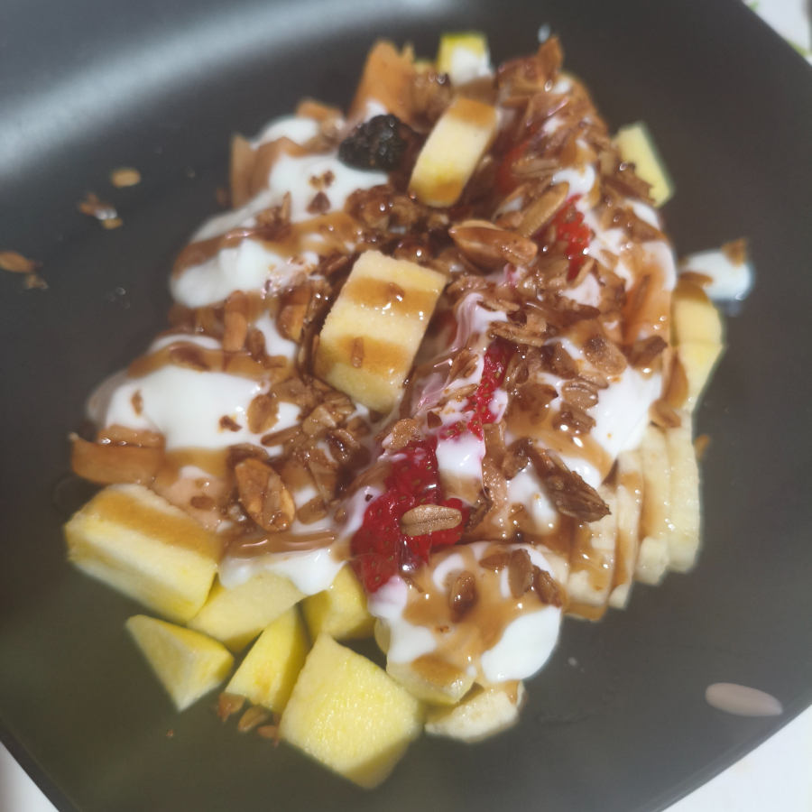 Plato de fruta con Manzana, Plátano, Melón, Fresa. Acompañado de granola casera y yogurth natural con jarabe de mapple