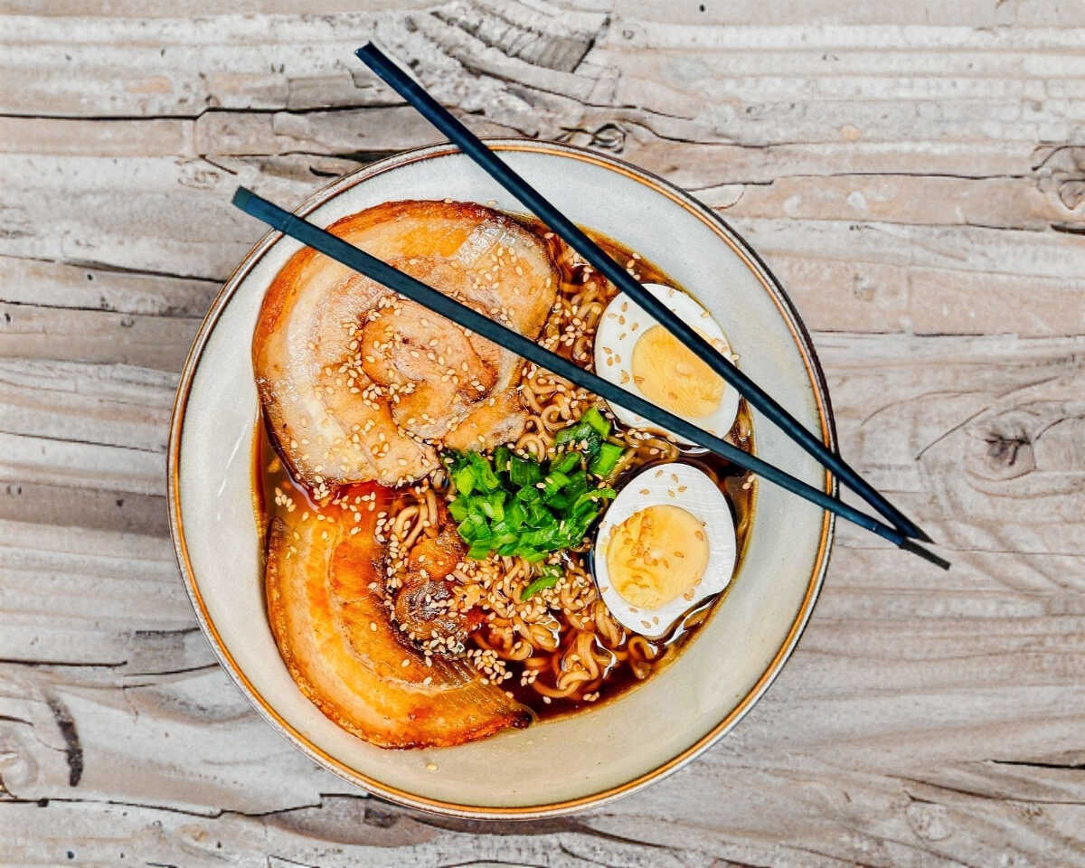 Caldo profundo acompañado de fideos, rodajas de cerdo chashu ahumado, y se complementa con toppings cebollin, huevo y ajonjolli.