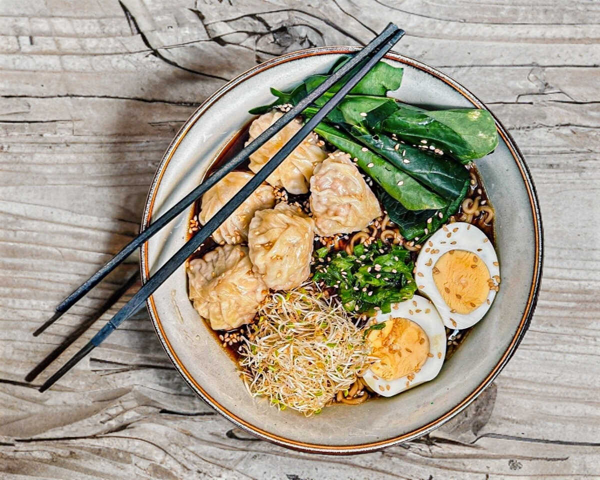 Caldo profundo acompañado de fideos, 5 deliciosos dumplings (vegetales), y se complementa con toppings, cebollín, huevo, espinaca, germen y ajonjolí.