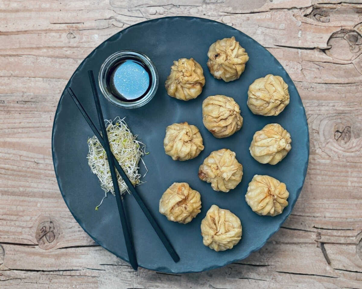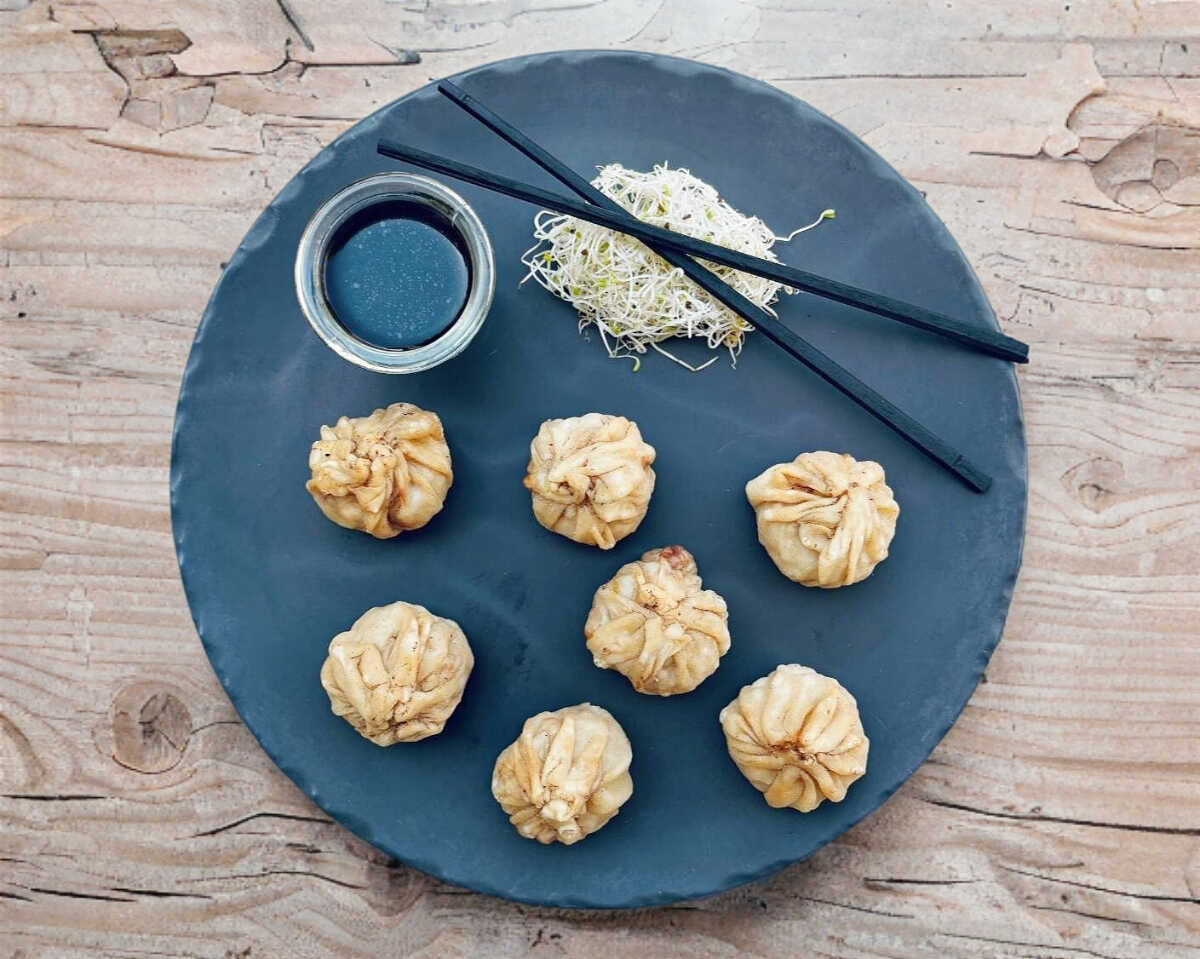 Deliciosos dumplings hechos a mano, rellenos de opciones irresistibles (camarón) camarones, repollo, cebolla, jengibre y especias.