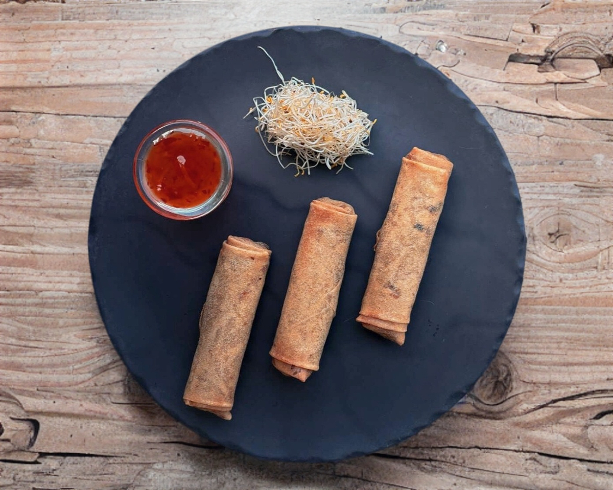 Deliciosos rollos frescos y crujientes envueltos en papel de arroz, rellenos con una mezcla vibrante de verduras frescas.