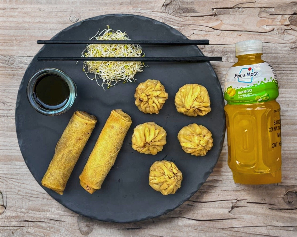 5 Dumplings de carne de puerco, mas 2 rollos primavera mas una agua de mango con coco.