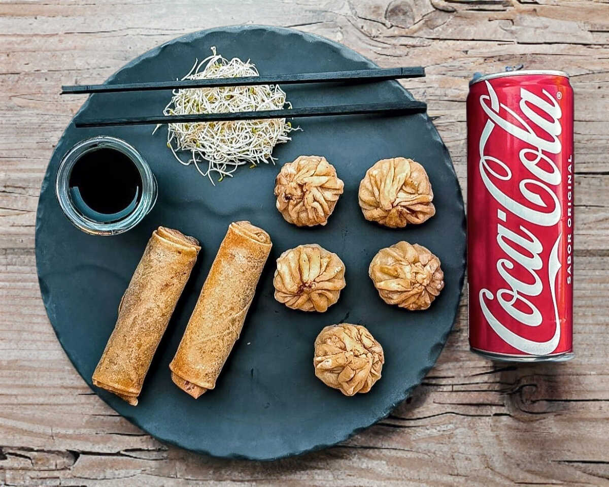 8 Dumplings de vegetales mas un rollo primavera mas una coca cola.