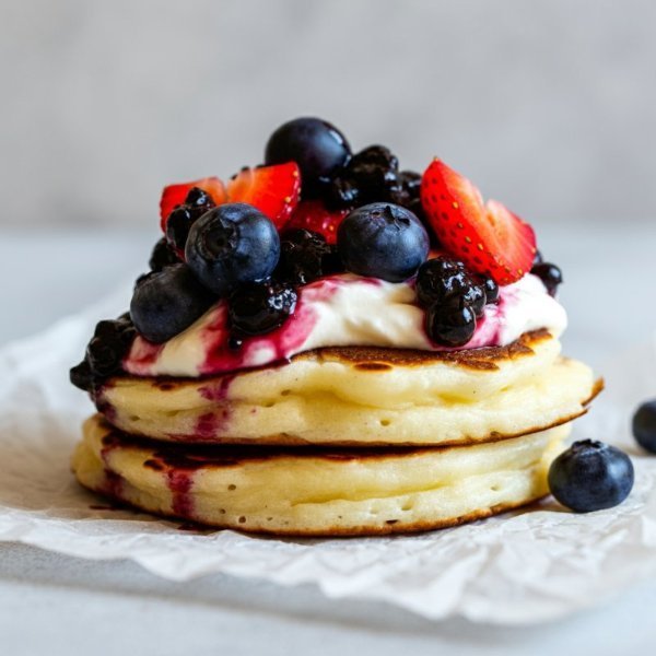 Hotcakes tradicionales de harina de trigo con mezcla de cheesecake y salsa de frutos rojos acompañados con miel de maple (aparte).