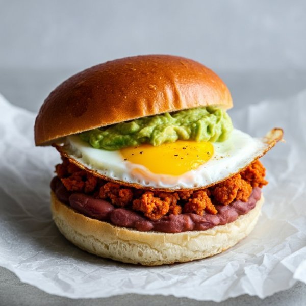 Sándwich en pan de papa con huevo estrellado, chorizo, frijol refrito y guacamole.