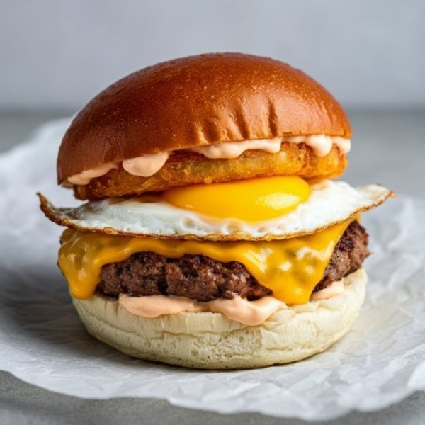 Sándwich en pan de papa con huevo, carne de hamburguesa, queso cheddar, hash brown y salsa Eggy.