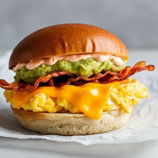 Sándwich en pan de papa con huevo revuelto, tocino, queso cheddar, guacamole y salsa Eggy.