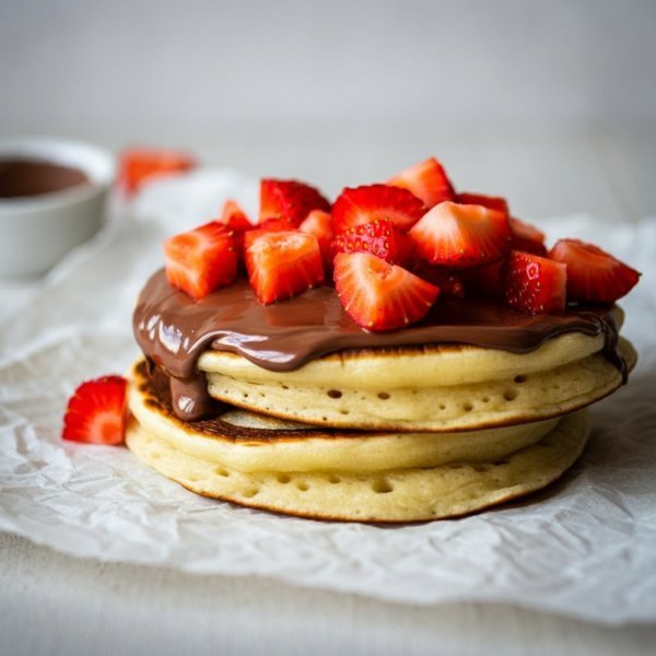Hotcakes tradicionales de harina de trigo con Nutella y trozos de fresa acompañados con miel de maple (aparte).